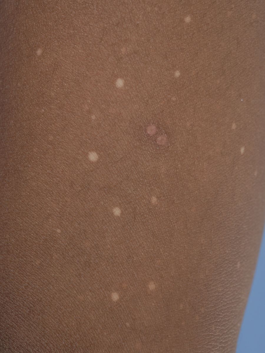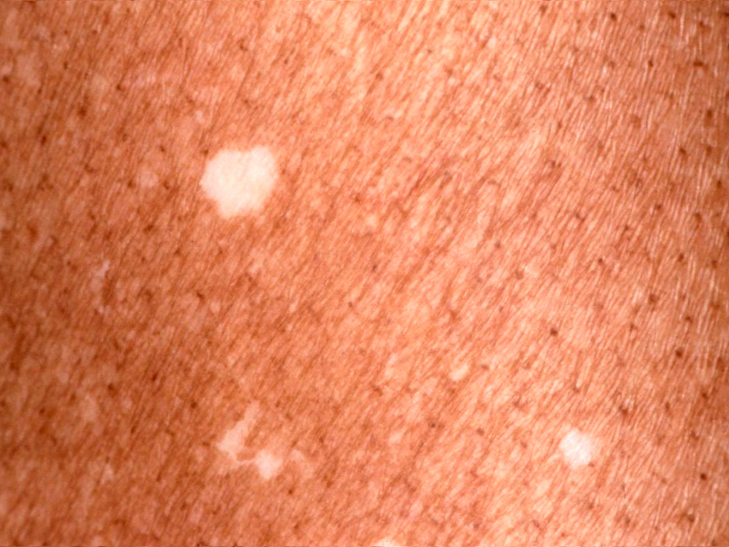 guttate hypomelanosis) ontstaan er kleine (druppelvormige, 2-5 mm grote) gedepigmenteerde