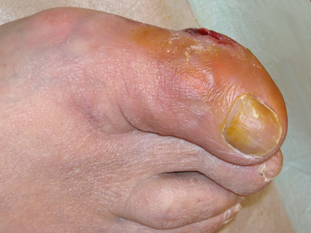 doorschemerende nodi in de huid, deels aan het oppervlak (ophopingen van urinezuurkristallen).