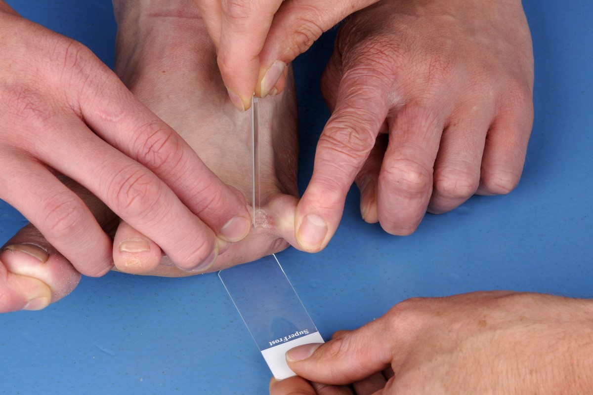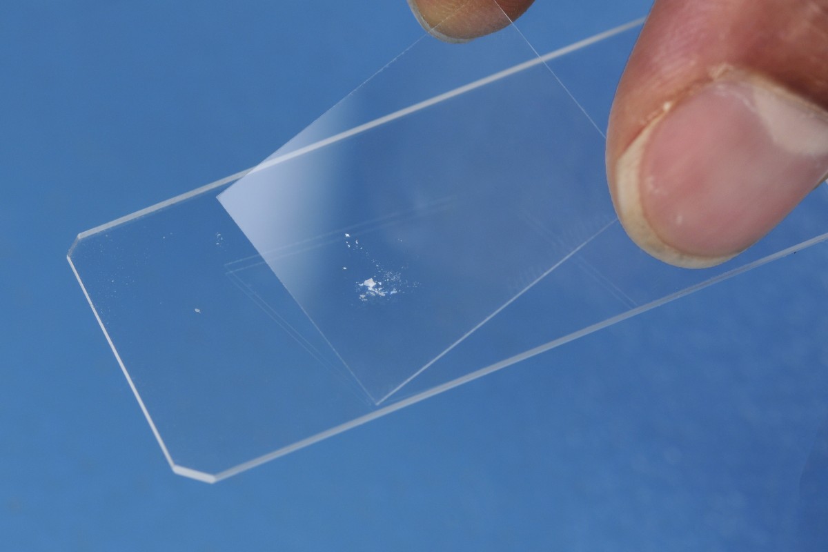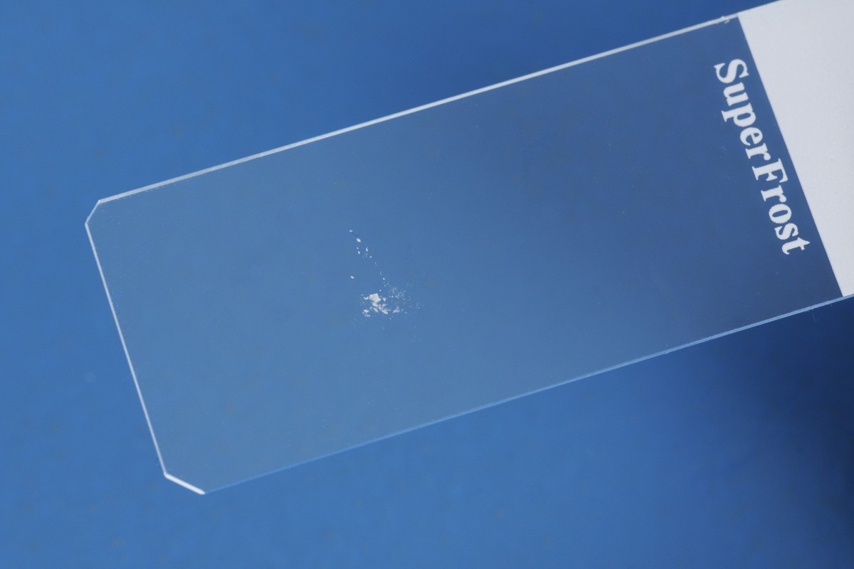 met het ene microscoopglas schraapsel op het andere). Verzamel de schilfers op het midden van een microscoopglas