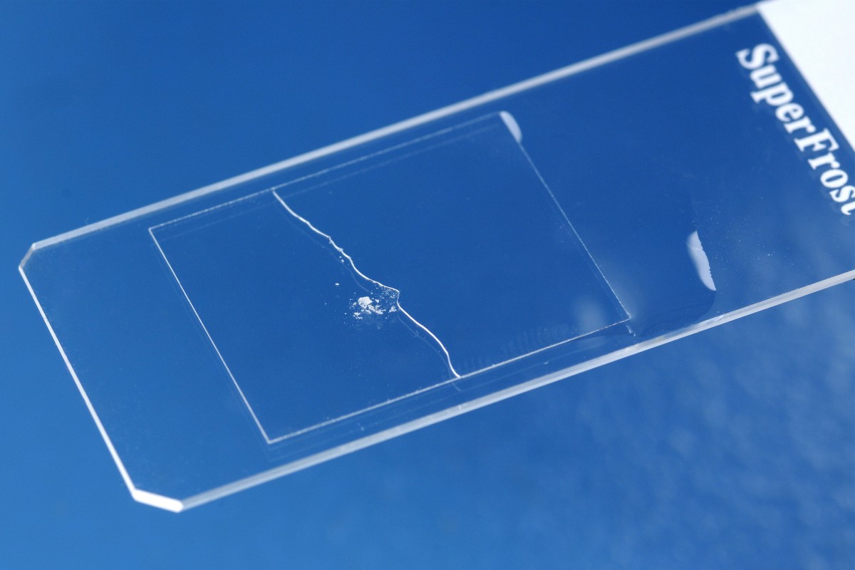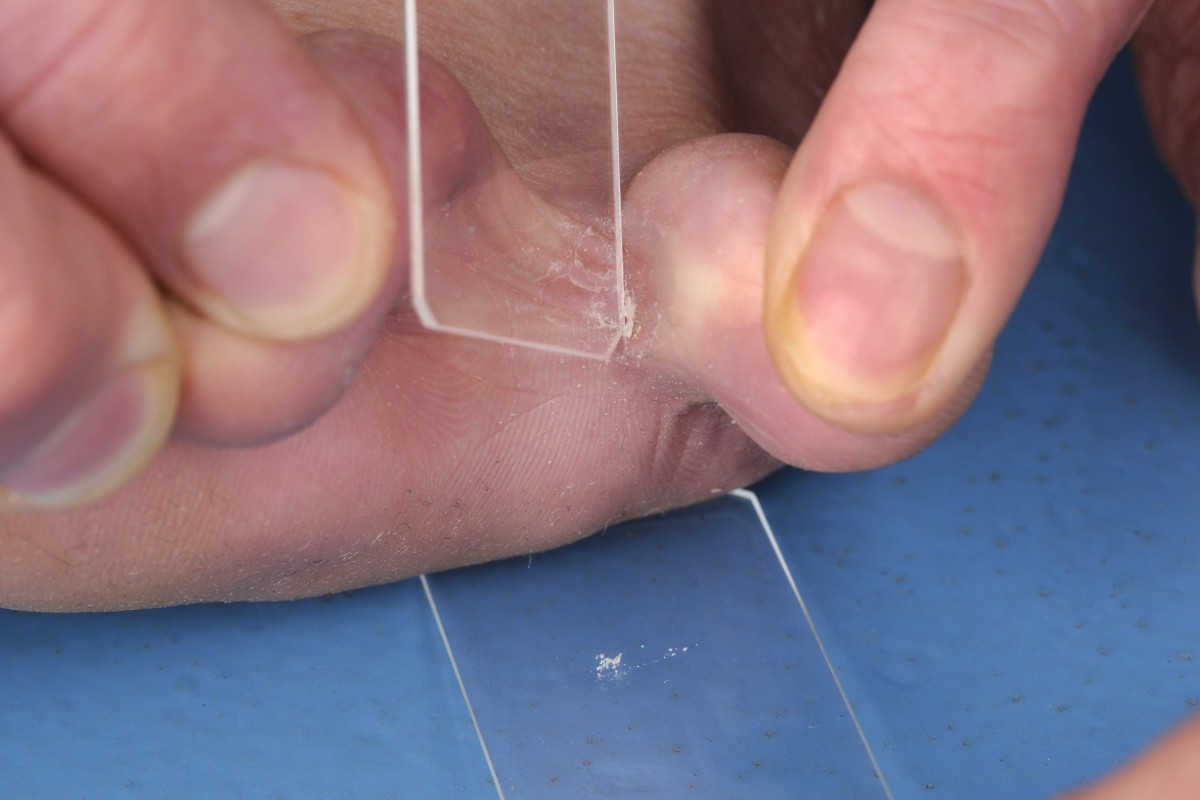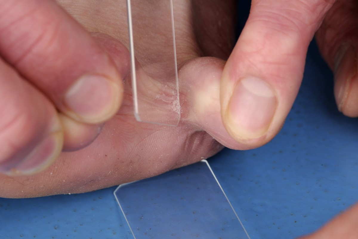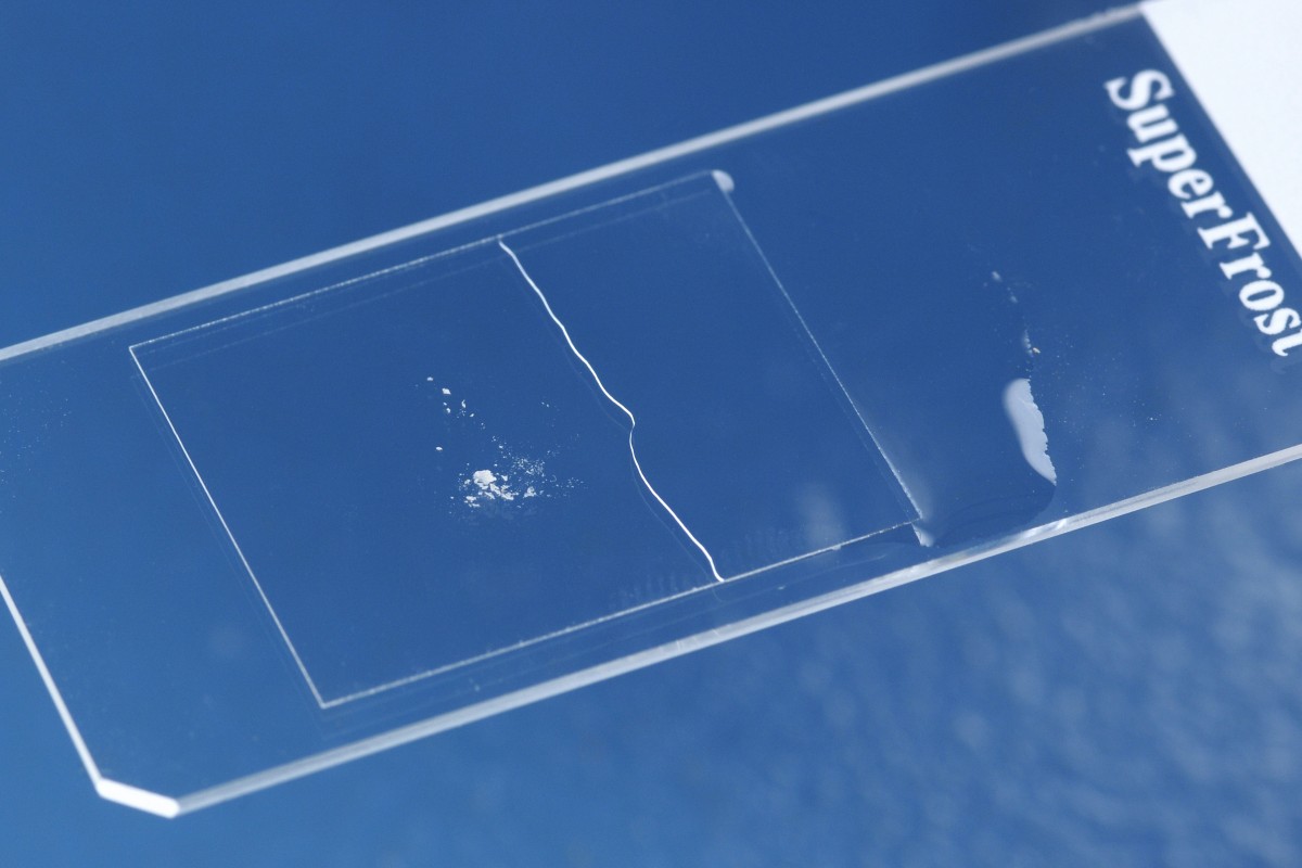 met het ene microscoopglas schraapsel op het andere). Verzamel de schilfers op het midden van een microscoopglas