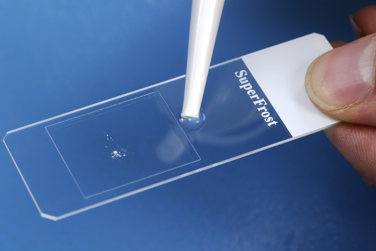 Druk het dekglas goed aan en breng een druppel KOH-oplossing