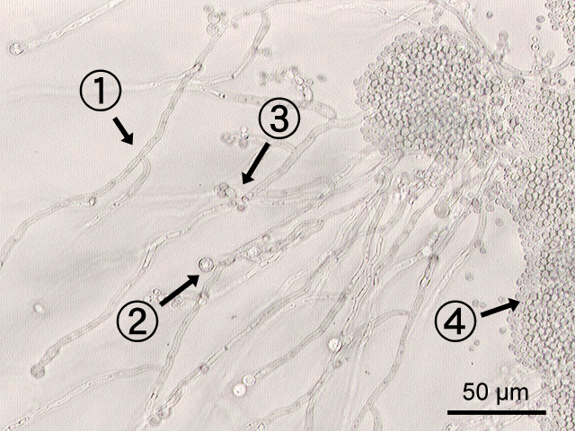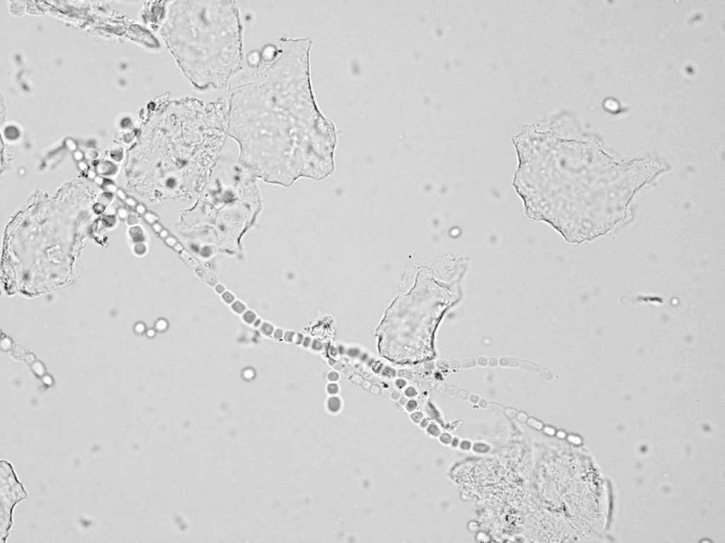 pseudohypha (1). Maar de gist komt ook in de vorm van gistbolletjes