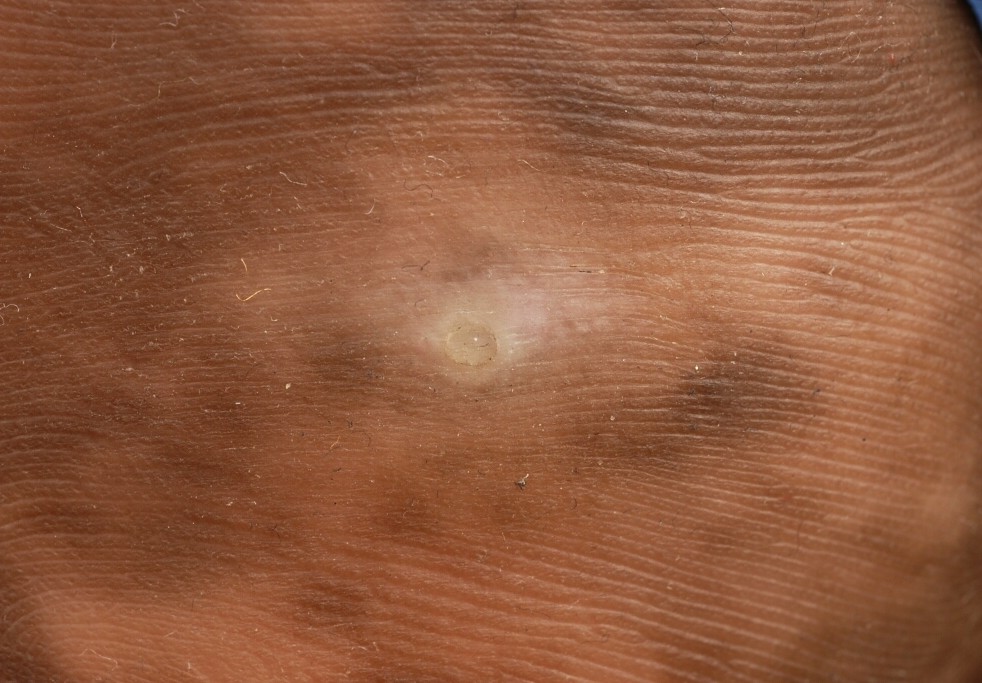 of rond-ovale keratotische papeltjes op de handpalmen en voetzolen aanwezig