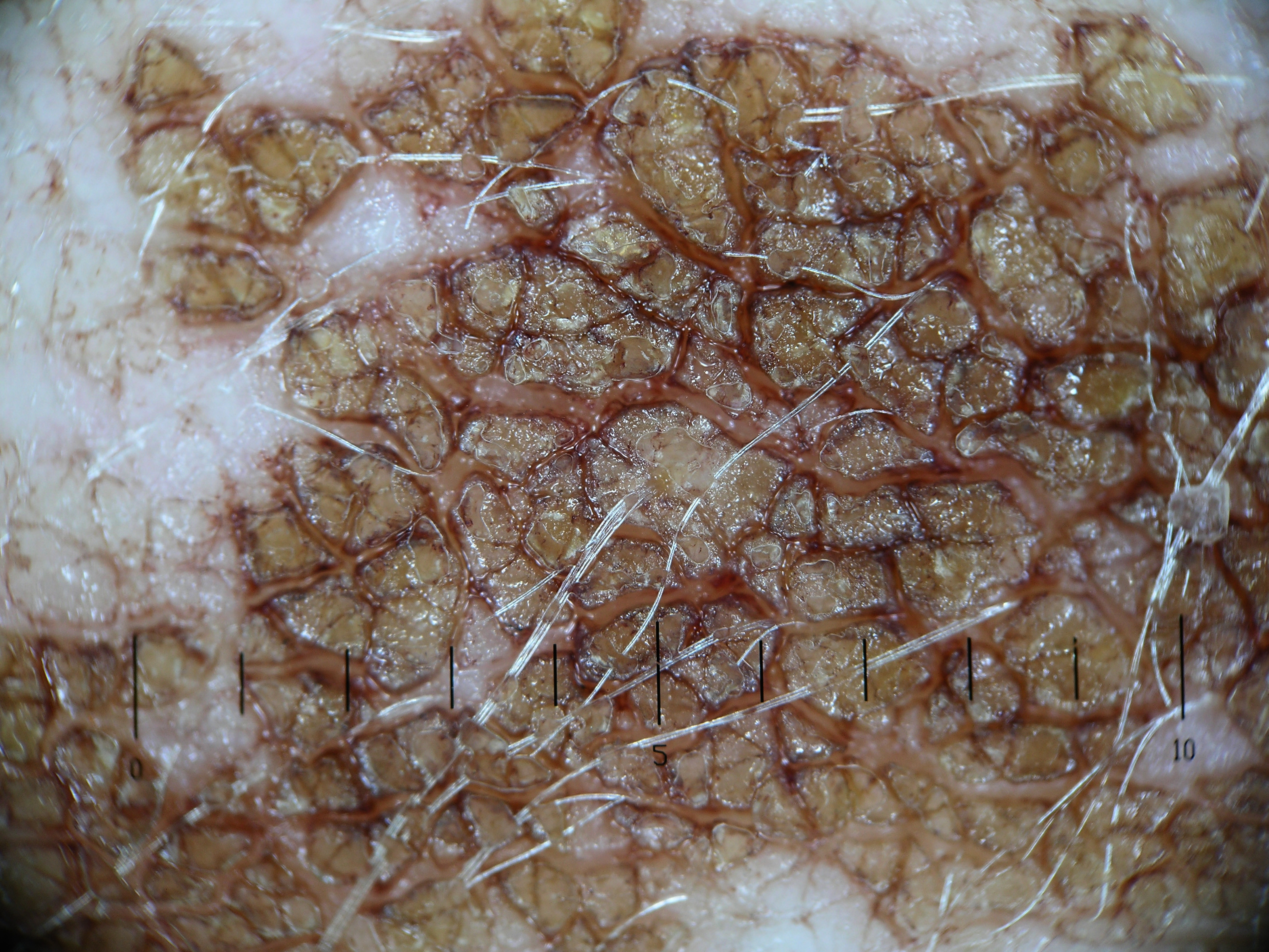 retelijsten, en keratine pluggen. Vaak hyperpigmentatie en een perivasculair