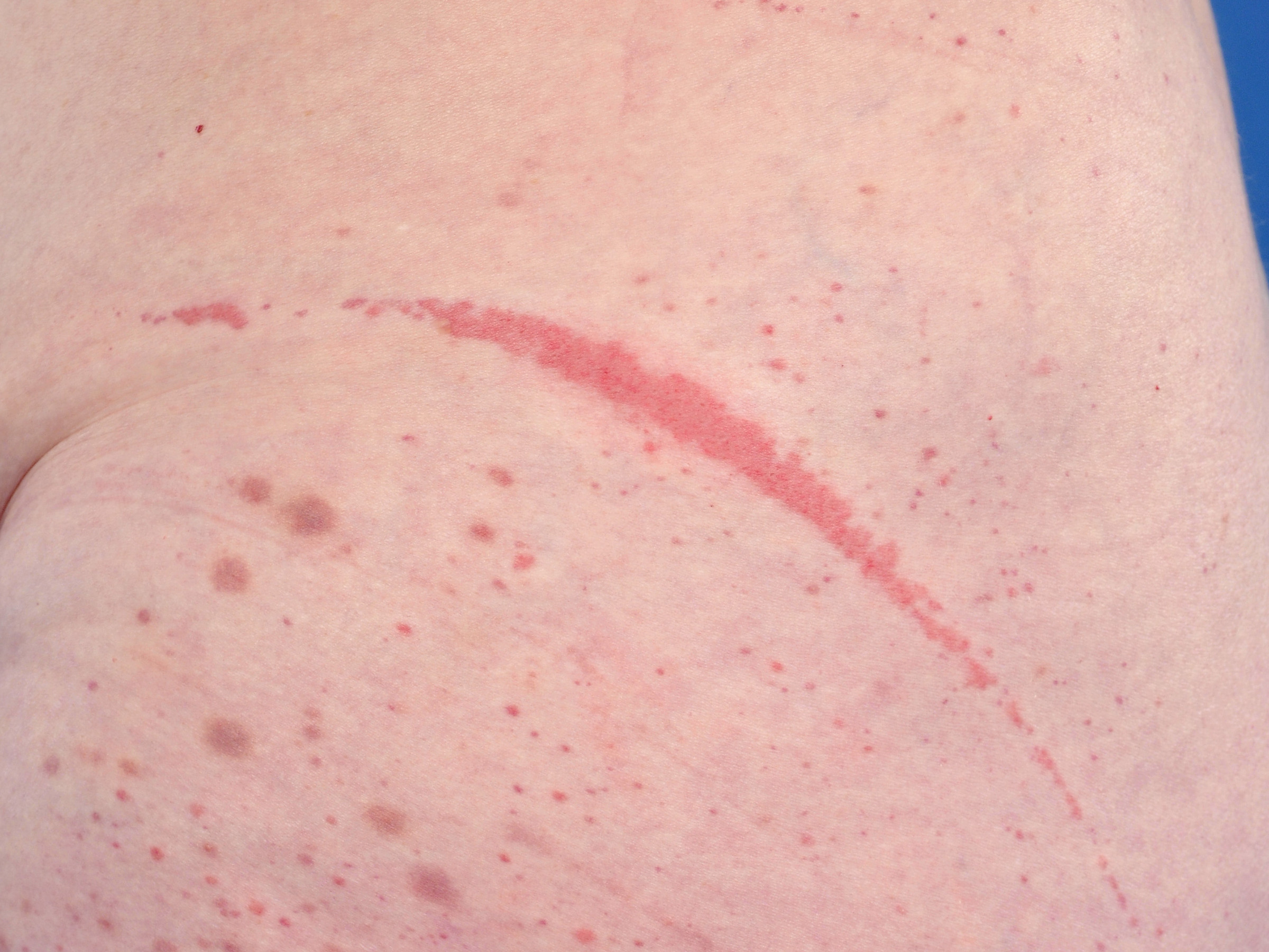 in een kras van de huid kunnen lineair gerangschikte impetigo pusteltjes ontstaan,