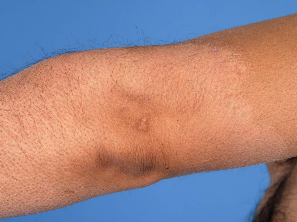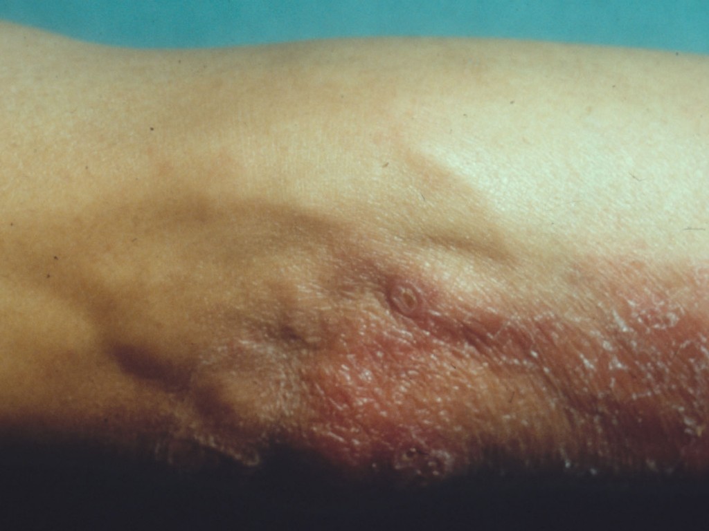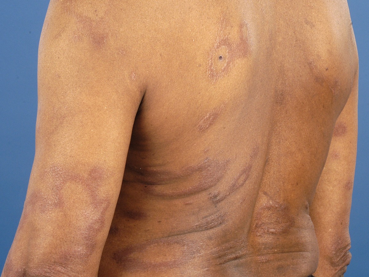 ICD-10 A30.4): multiple symmetrische erythemateuze, soms gehypopigmenteerde