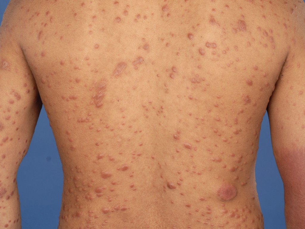 ontstaan steeds meer noduli op de romp en extremiteiten (rond gewrichten) en