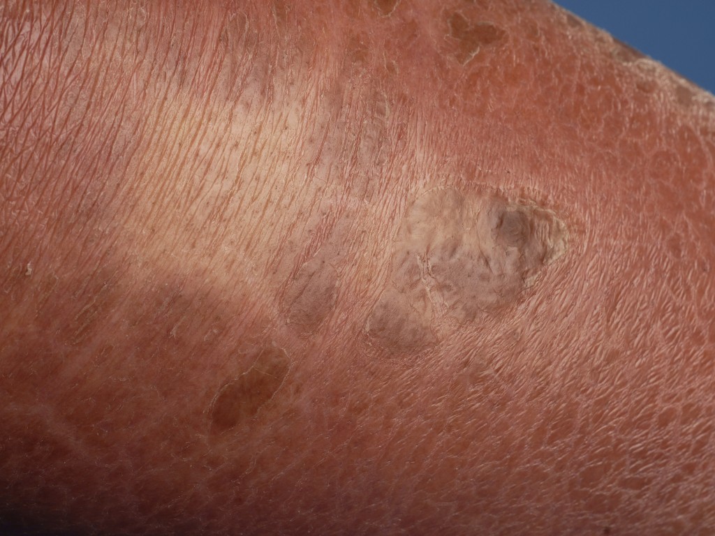 plaques, schilferend en scherp begrensd. Verminderde sensibiliteit. Meerdere