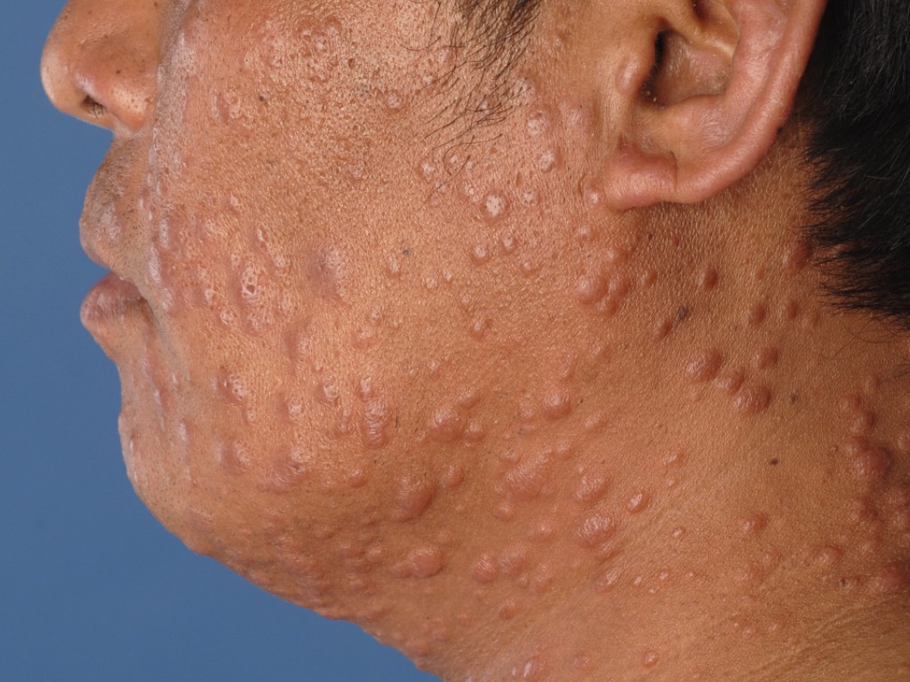 in het gelaat (oren en neus, facies leonina). Wenkbrauw uitval. Ulceratie neusslijmvlies.