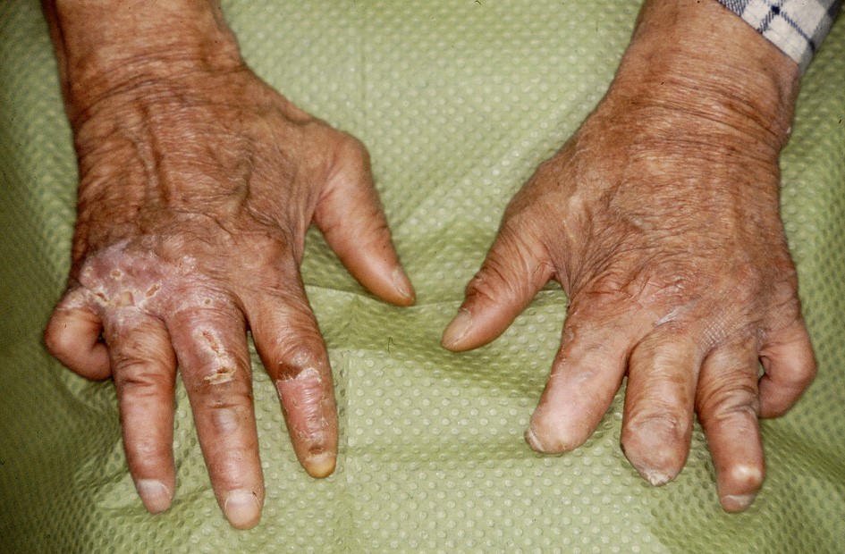 De botten in de distale kootjes zijn vaak aangetast en tonen