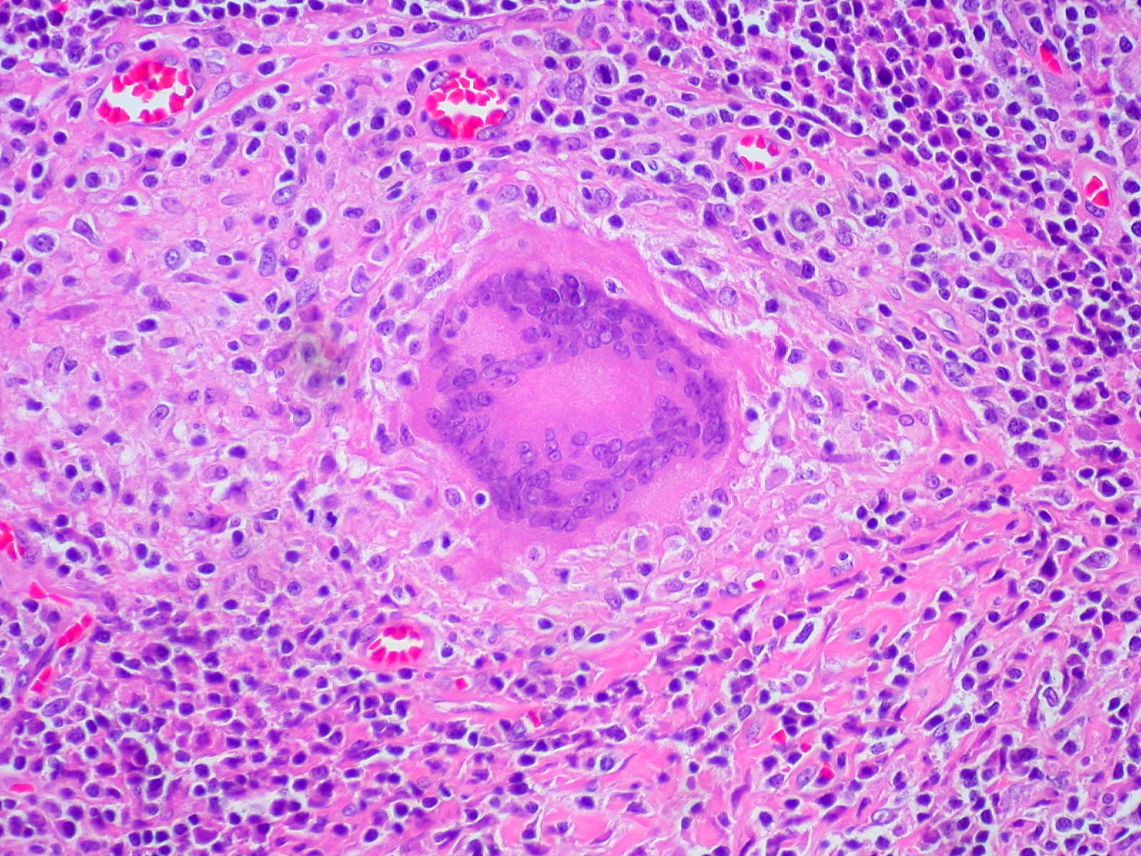 vasthoudt (ball-and-claw). Het infiltraat is nodulair en bestaat uit lymfocyten