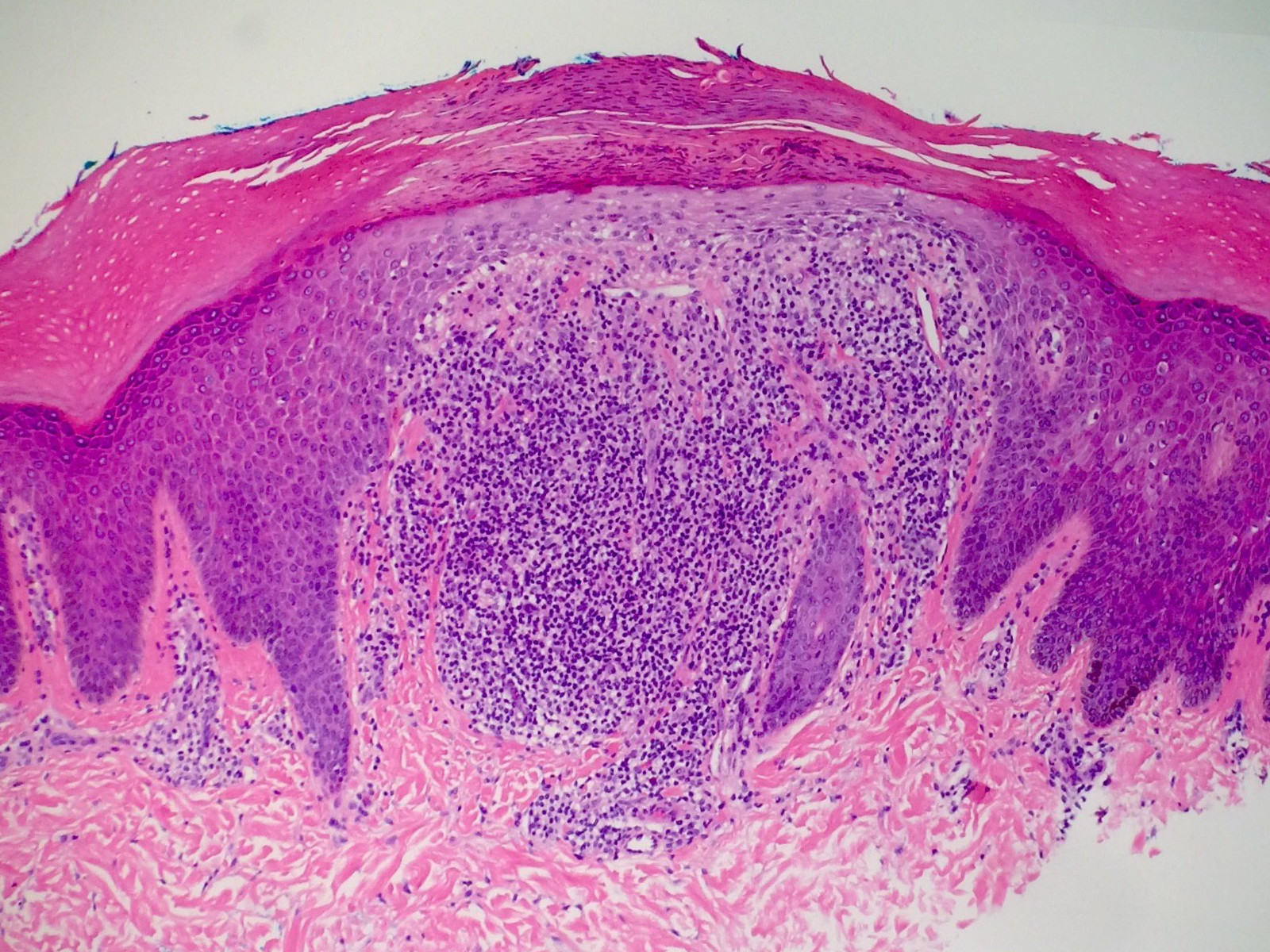 pigmentincontinentie. De epidermis toont hierboven geringe compacte hyperkeratose,