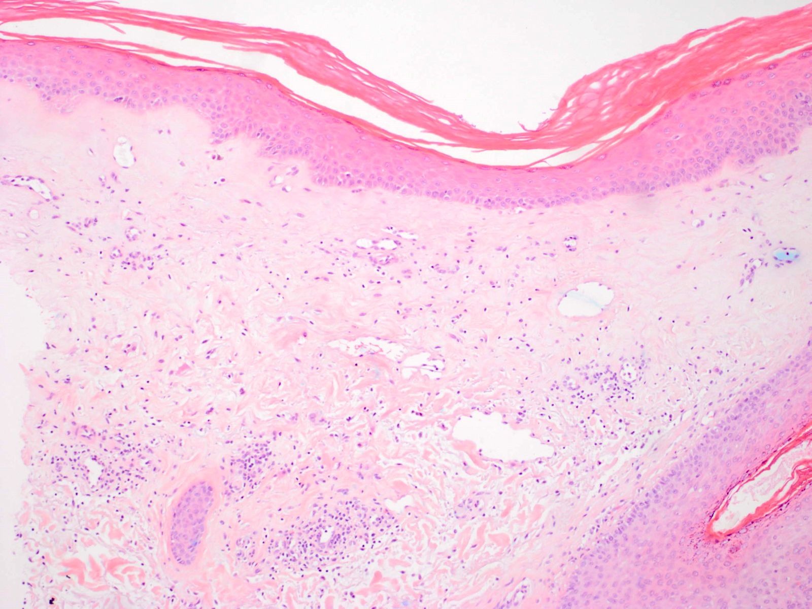 van het collageen), een lymfocytair infiltraat in vroege laesies, hyperkeratose,