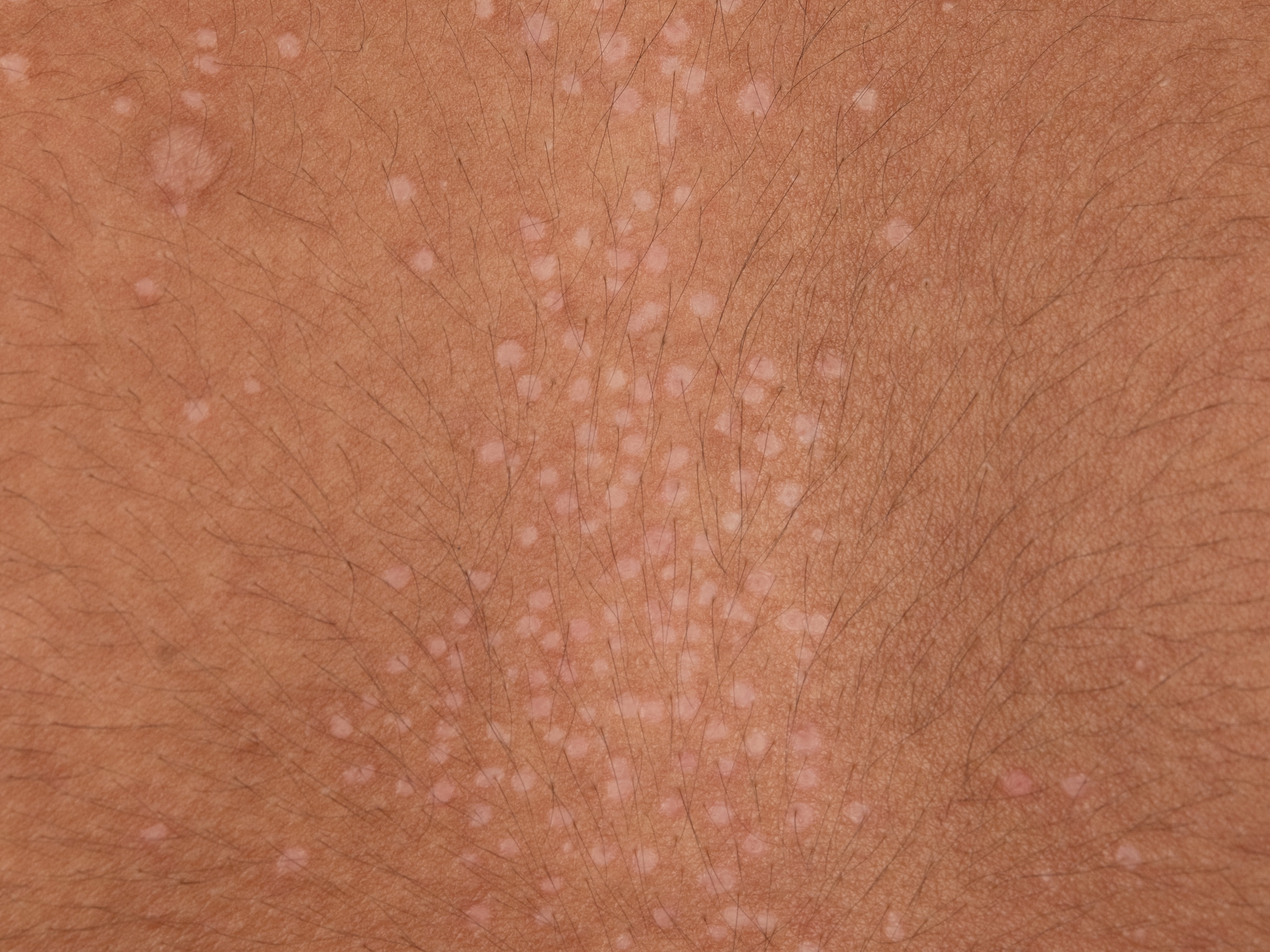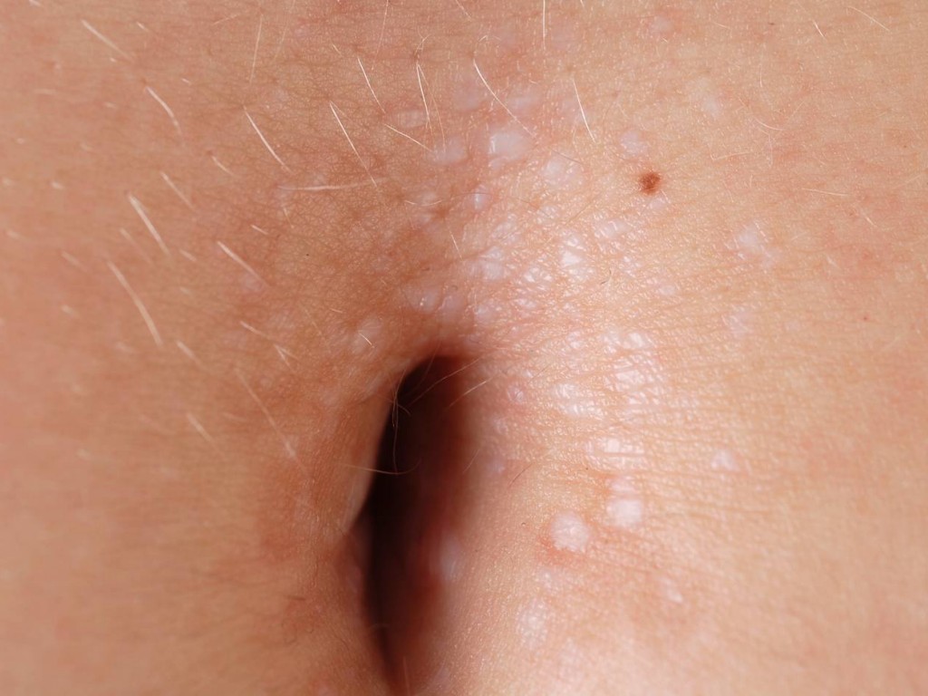 labia majora, clitoris, perianaal), ook op thorax, rondom navel, ellebogen,