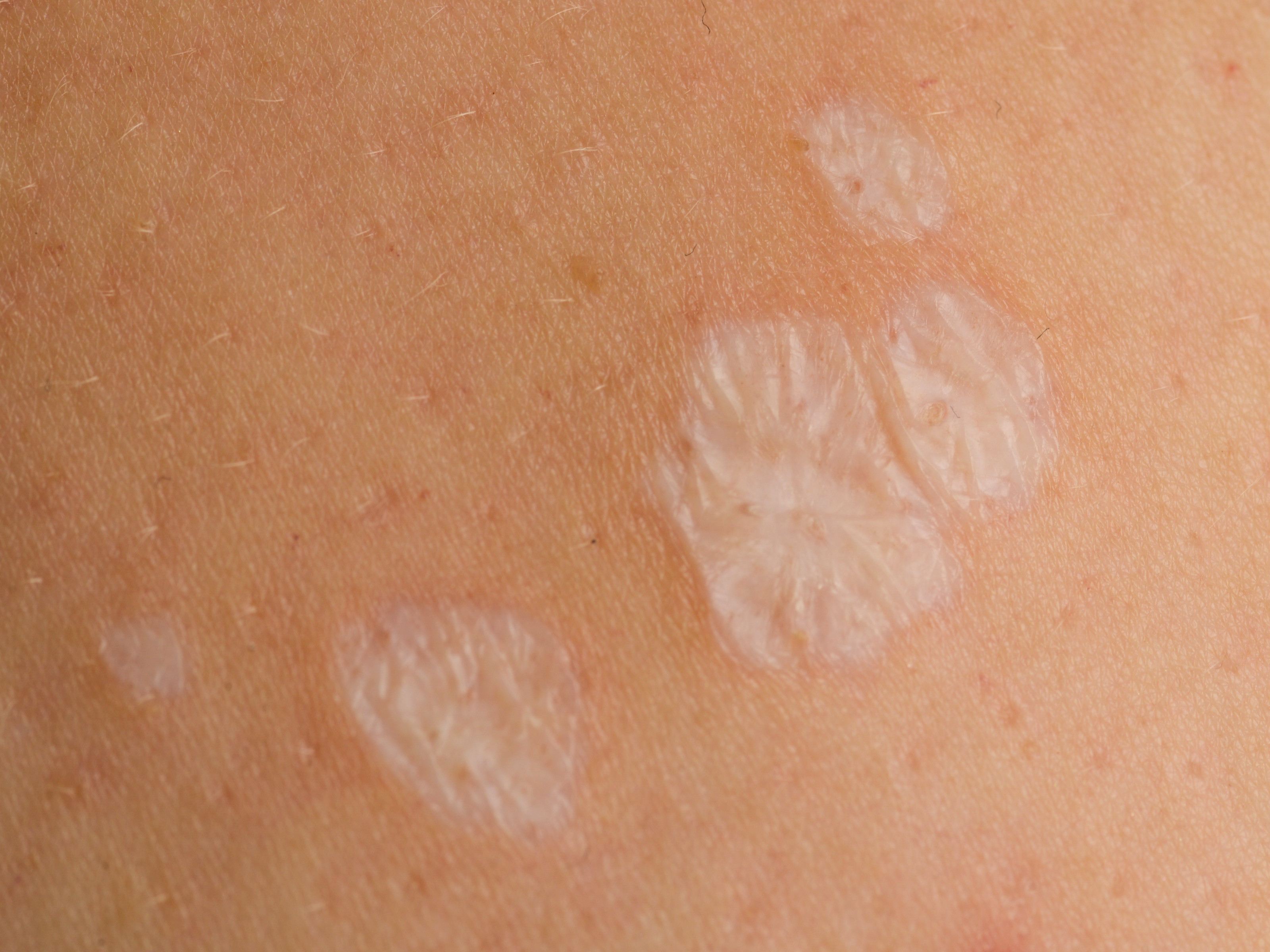 in de vorm van witte geïndureerde plaques, soms multipele kleine ronde