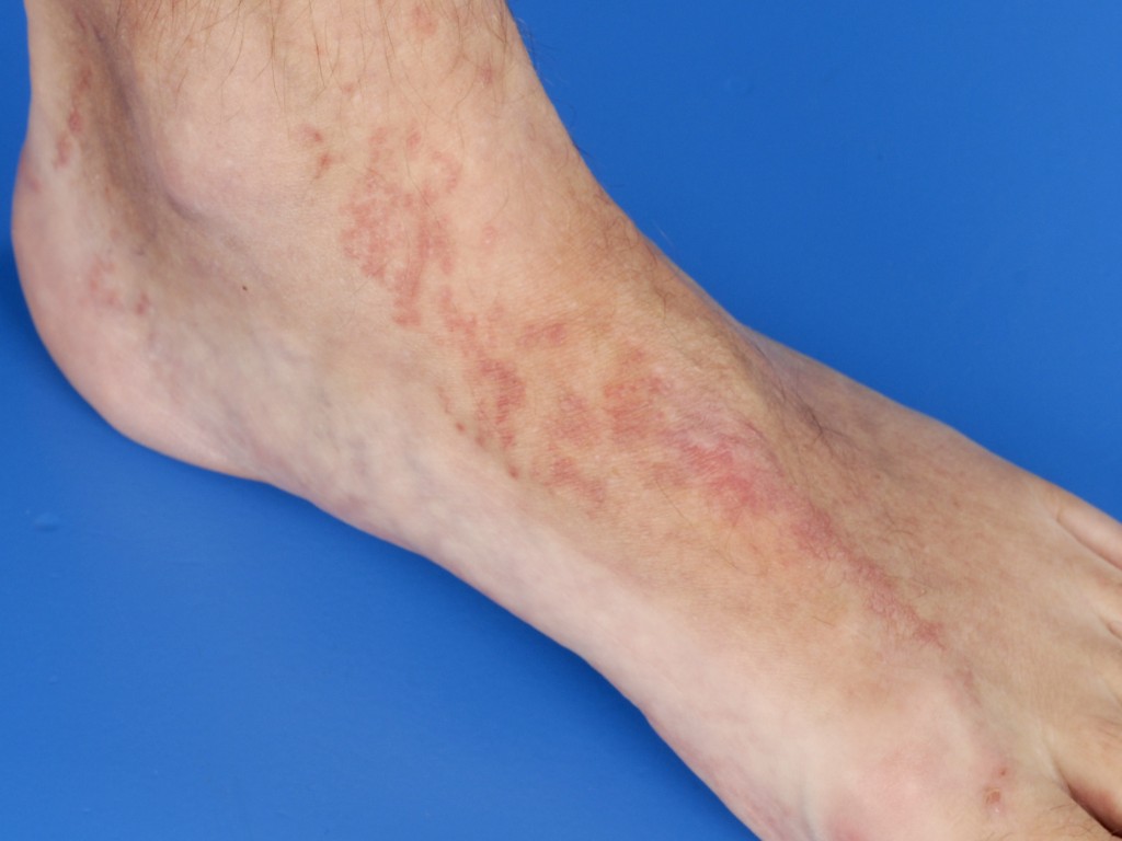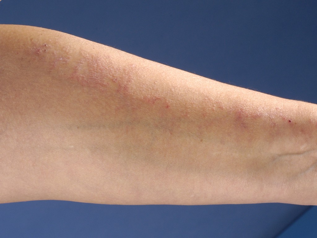 schilferend of jeukend, die kunnen conflueren tot een 1-2 cm brede strook, lineair