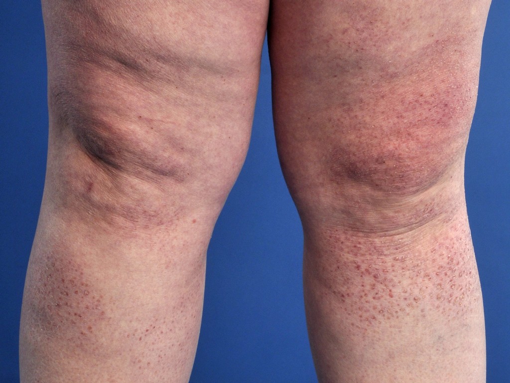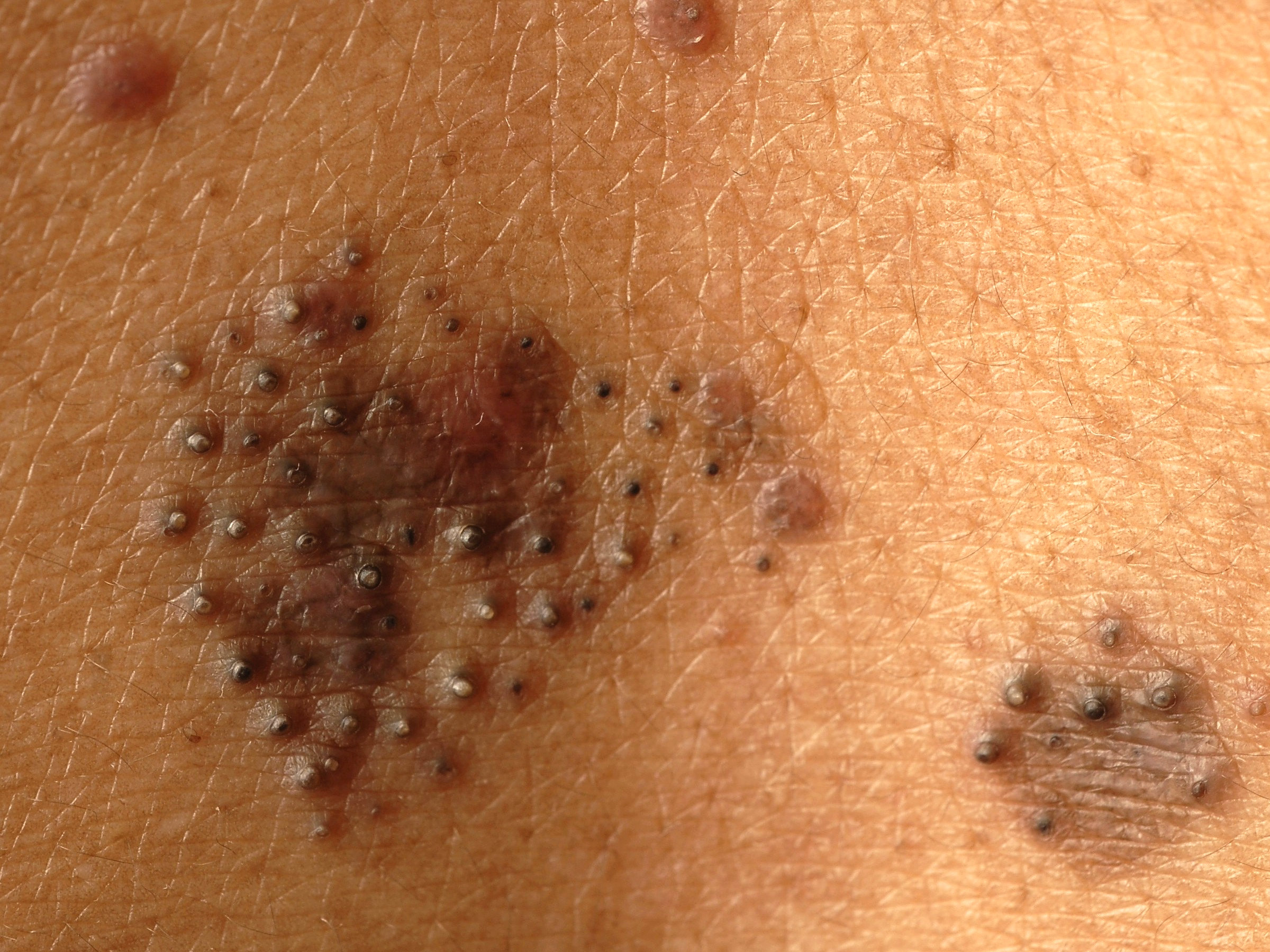 kan men multipele rood-bruine hyperkeratotische papeltjes en een paars erytheem