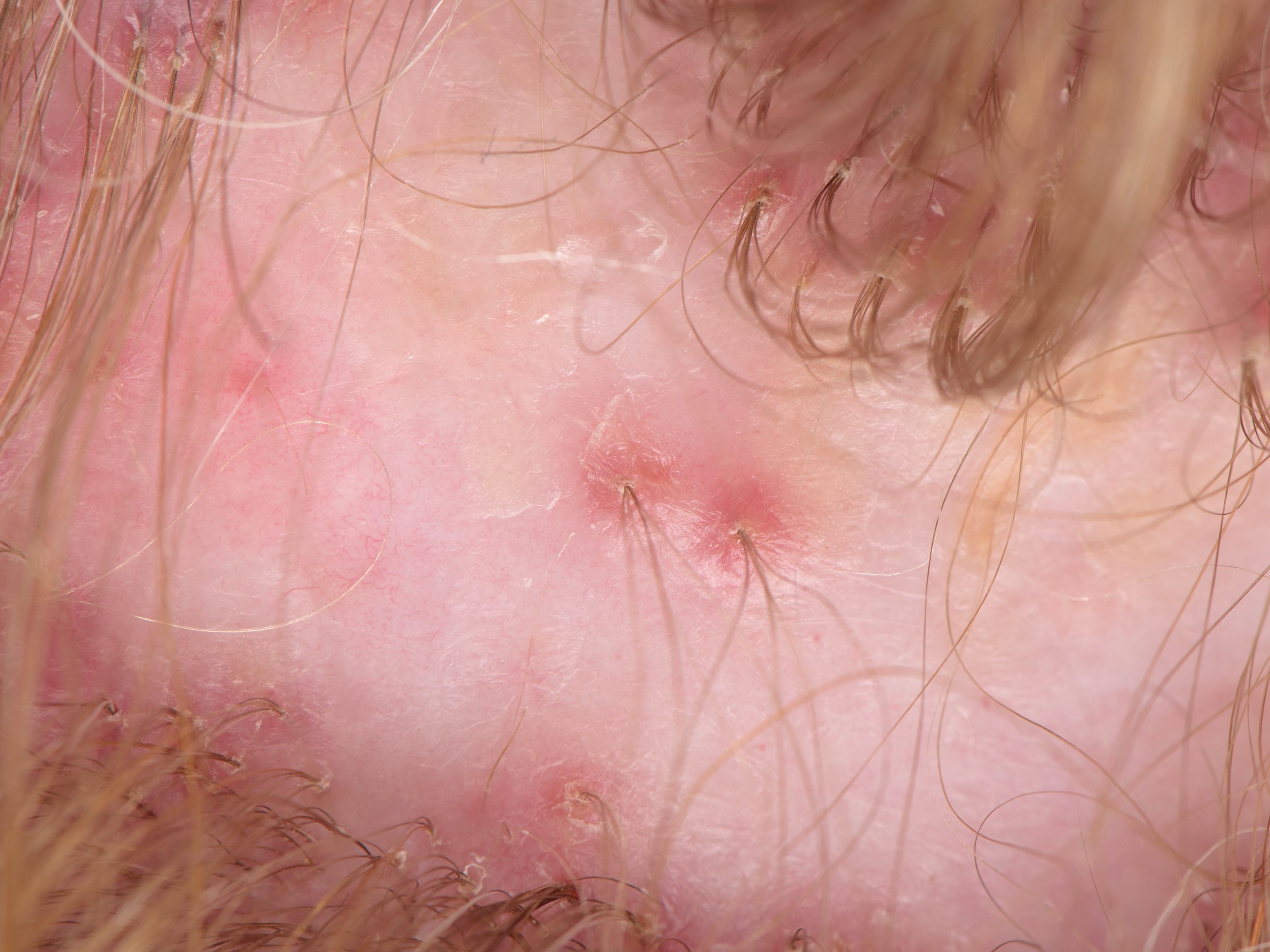 melkrode gebieden en tufting (5-7 haren).