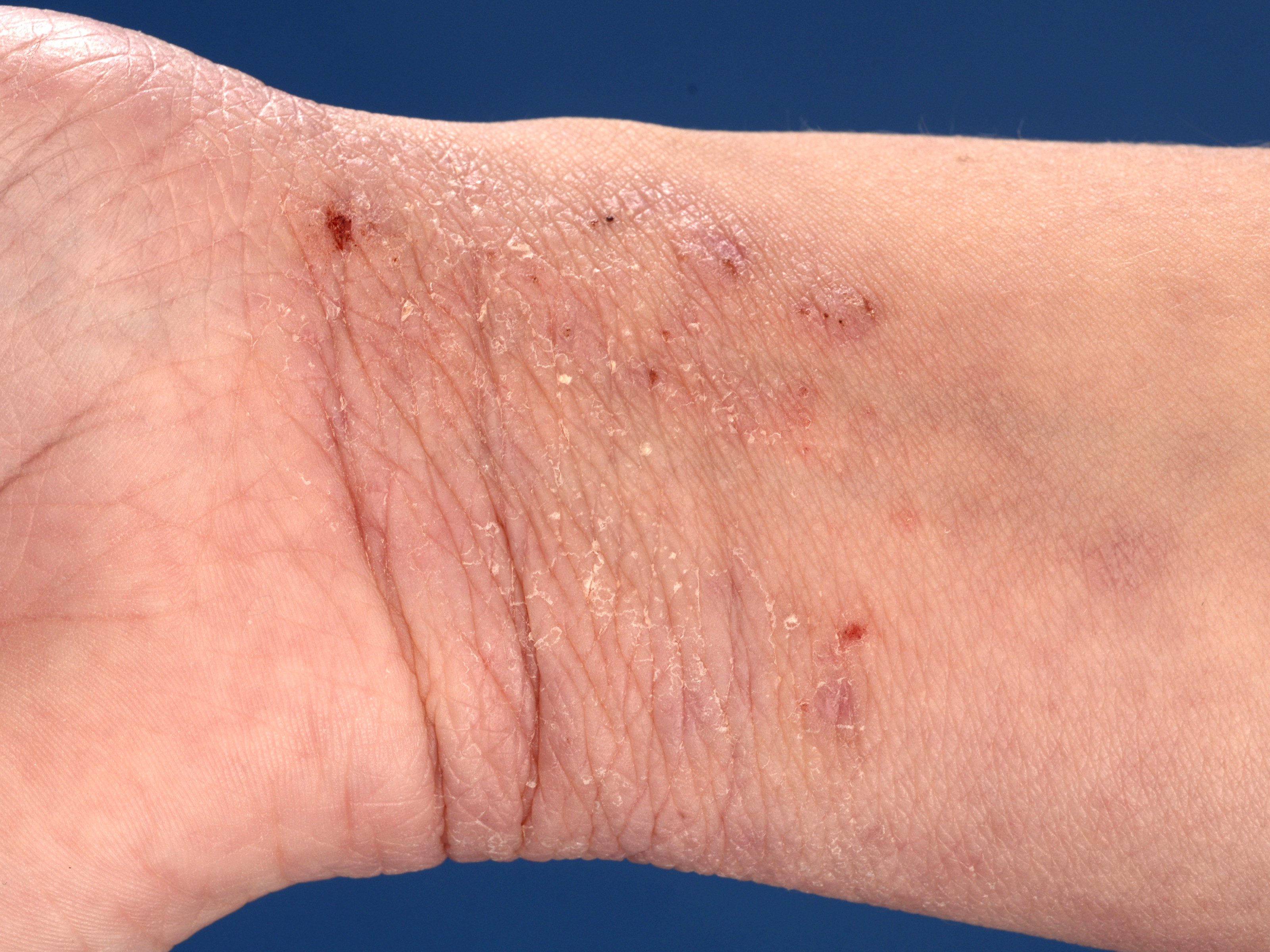 elleboogsplooien, de polsen, en soms op de handruggen en voetruggen. Ook wordt