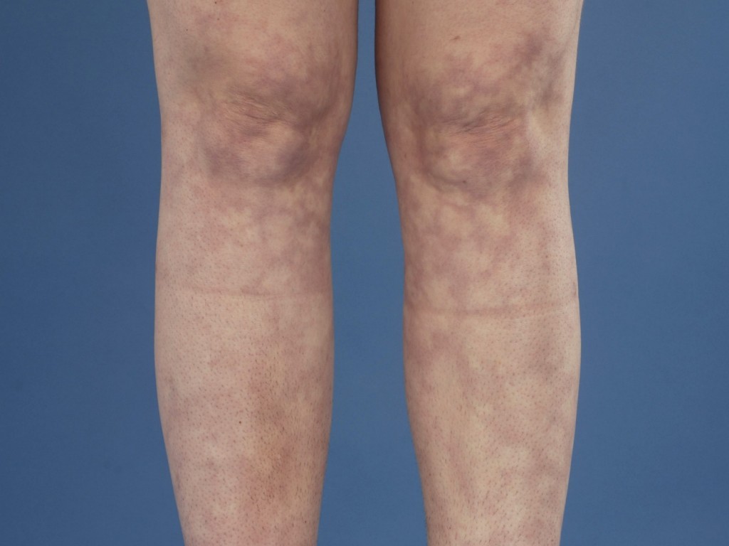 met grillige reticulaire livide verkleuringen (livedo reticularis). Het verergert