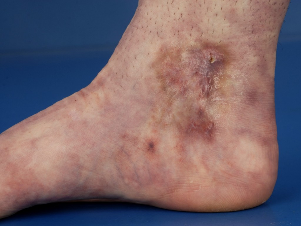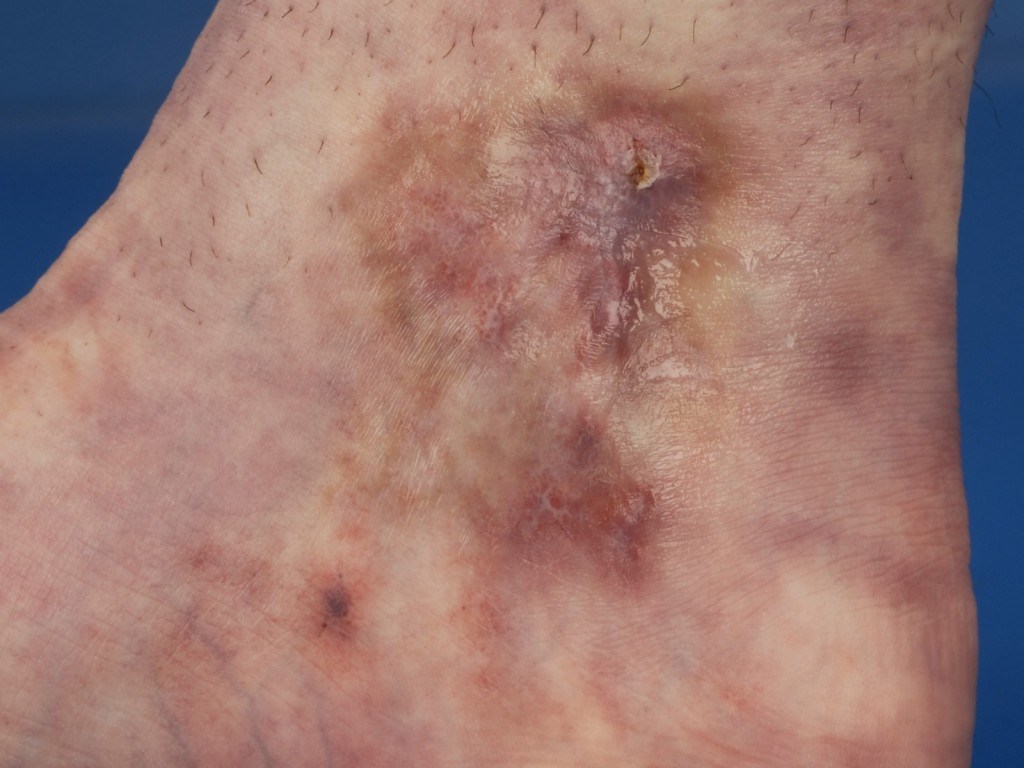 verkleuringen rond de enkels en soms op de voorvoet, met daarin ulceraties.