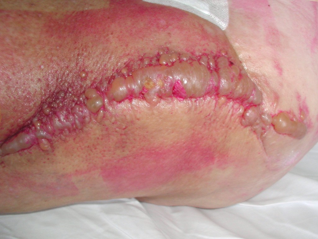begint als een subcutane palpabele zwelling of een niet genezend bloedend litteken,