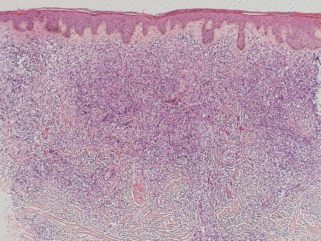dermis bevindt zich een dicht infiltraat van atypische lymfoïde cellen. De lymfoïde