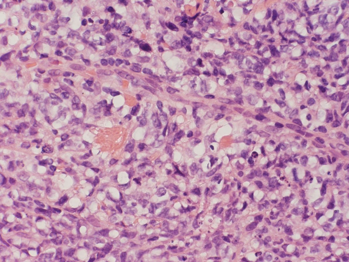 cellen tonen vergrote, blazige, gedenteerde kernen, meerdere mitose-figuren