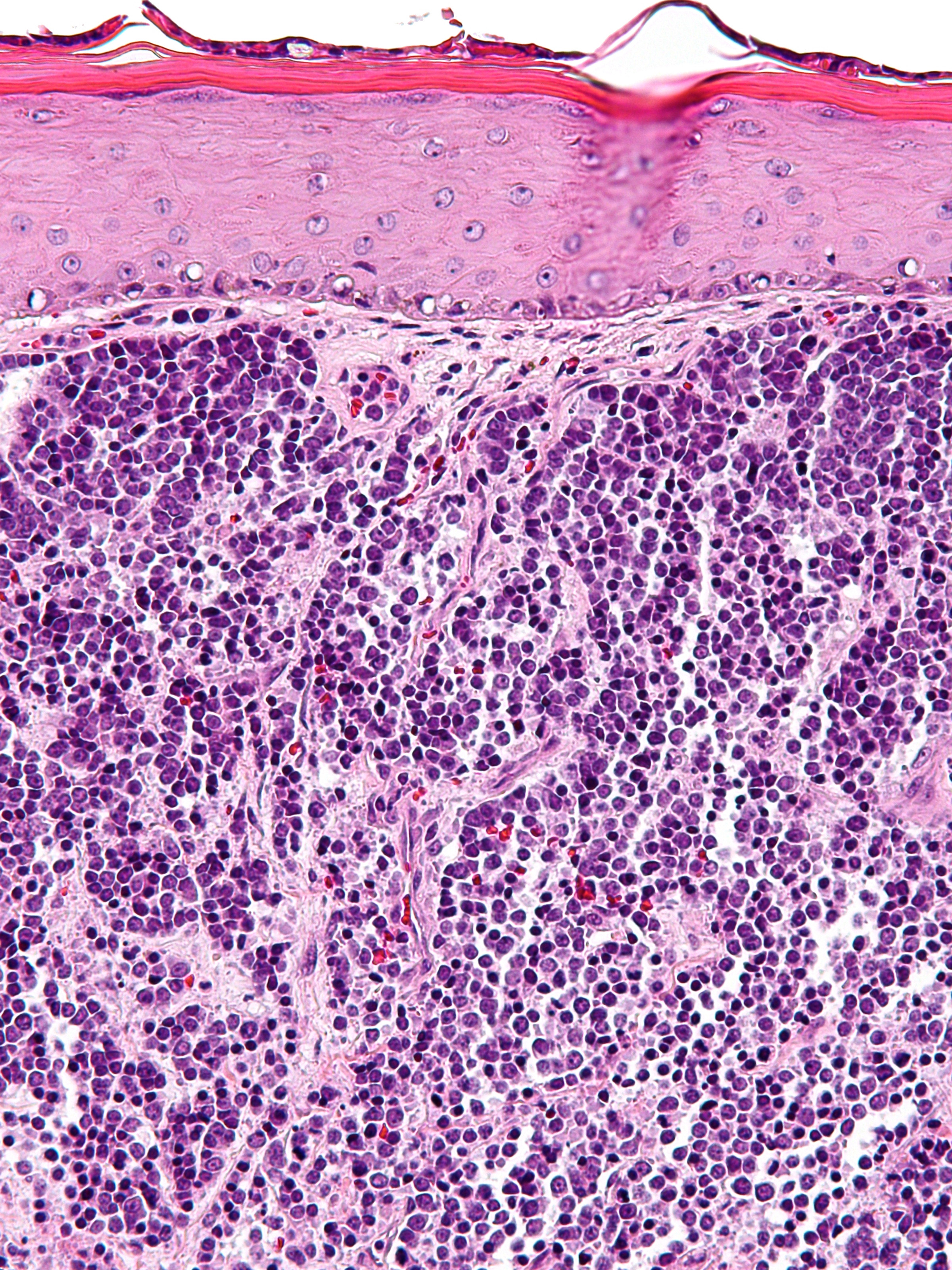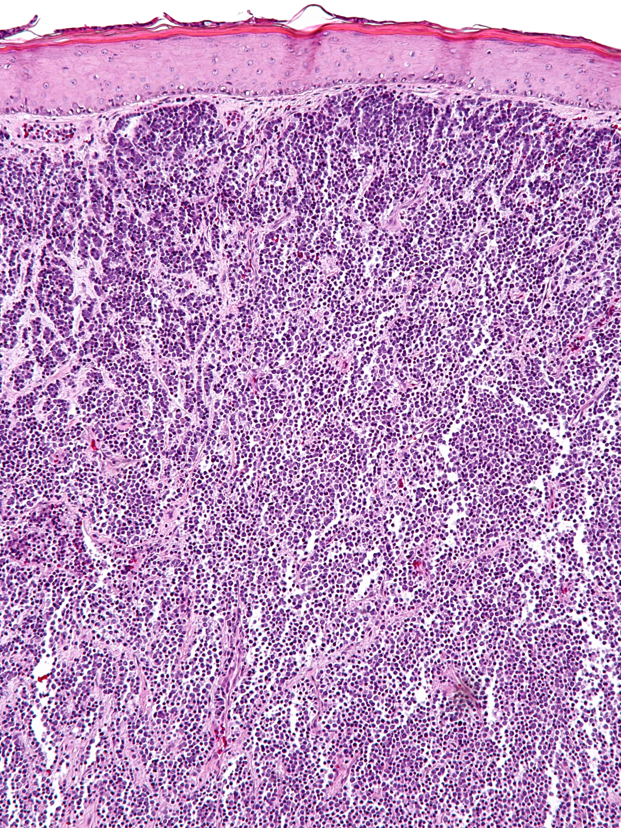 In de dermis, soms reikend tot in subcutis zijn velden van kleine ronde tumorcellen te zien (‘small blue round cells’). De tumorcellen zijn meestal gerangschikt in nesten, platen of strengen (trabekels). Soms worden ‘Homer-Wright pseudo-rosetten’ gezien, dat zijn kransen van tumorcellen rond een centrale zone gevuld met neurofibrillair materiaal, typerend voor neuro-endocriene tumoren. De tumorcellen zijn klein tot middelgroot en hebben zeer weinig cytoplasma en grote kernen t.o.v. de hoeveelheid cytoplasma. De celkernen vertonen een karakteristiek ‘salt and pepper’ chromatinepatroon (fijnkorrelig chromatine) met onopvallende nucleoli. Er zijn vele mitosen te zien. De tumor kleurt aan met cytokeratine 20 (CK20) en met neuro-endocriene markers (chromogranine A, synaptofysine, CD56). TTF (positief bij longcarcinoom) en S100 (positief bij melanoom) zijn negatief. Bij ongeveer 80% van de gevallen kan het Merkelcel-polyomavirus in de tumorcellen worden aangetoond.