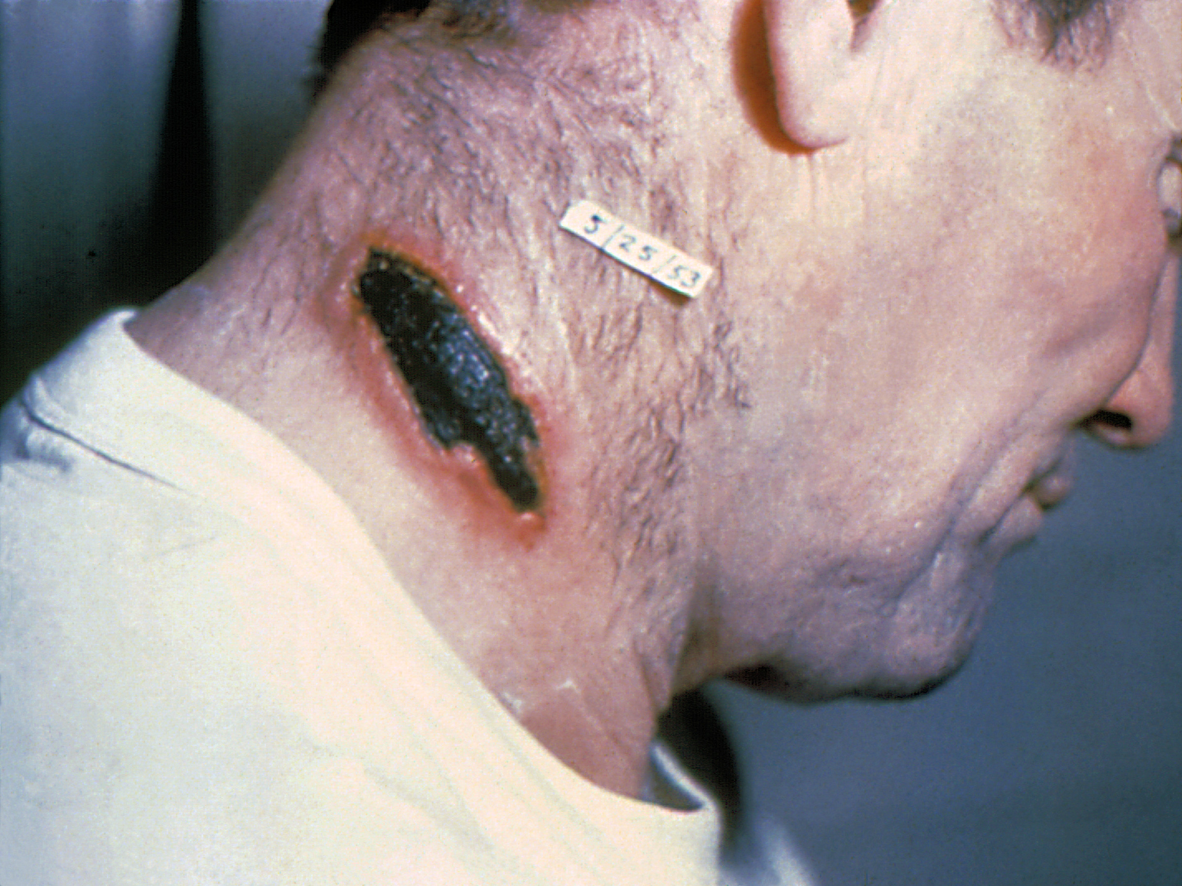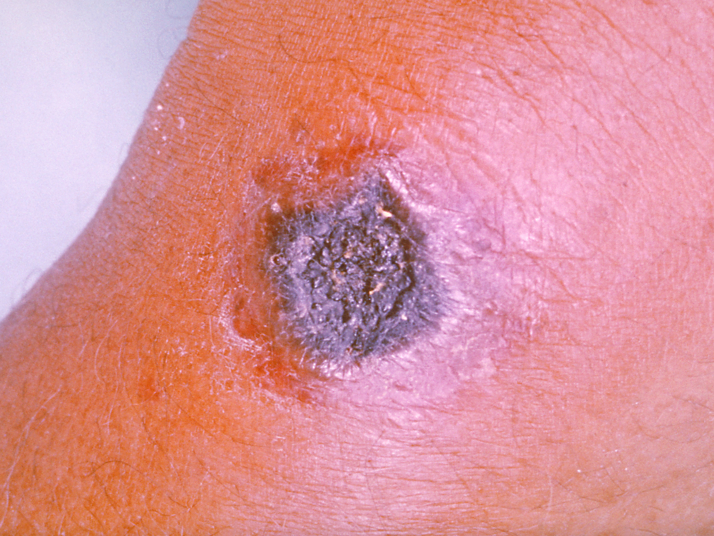 of crustae waaronder een harde haemorrhagisch-necrotische prop (