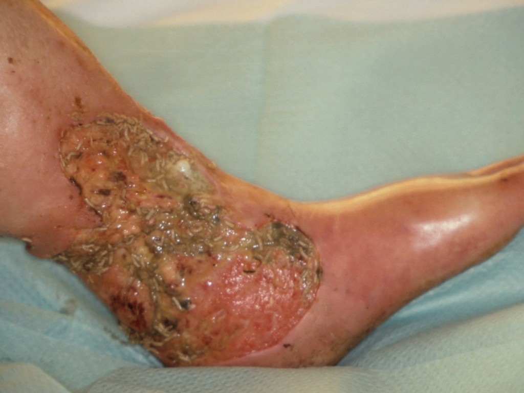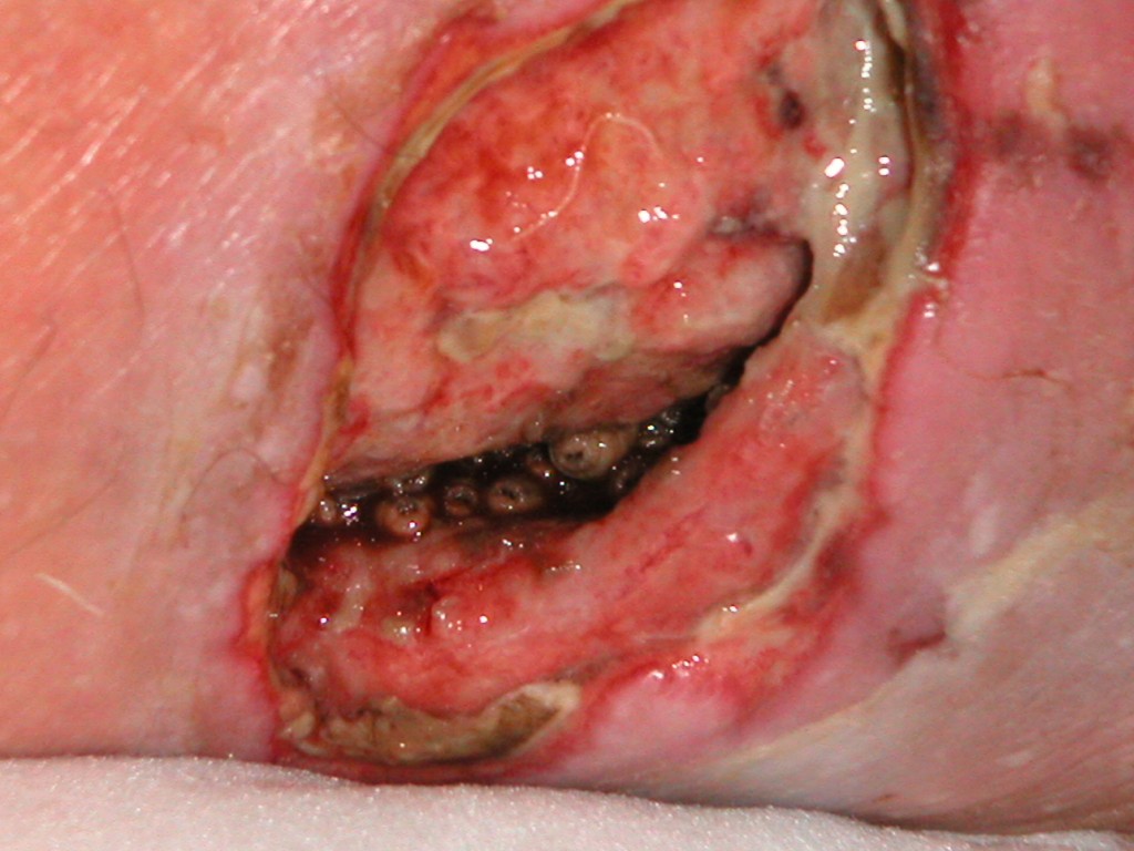 de vliegenlarven omgeven door een ontstekingsreactie), en de wondmyiasis