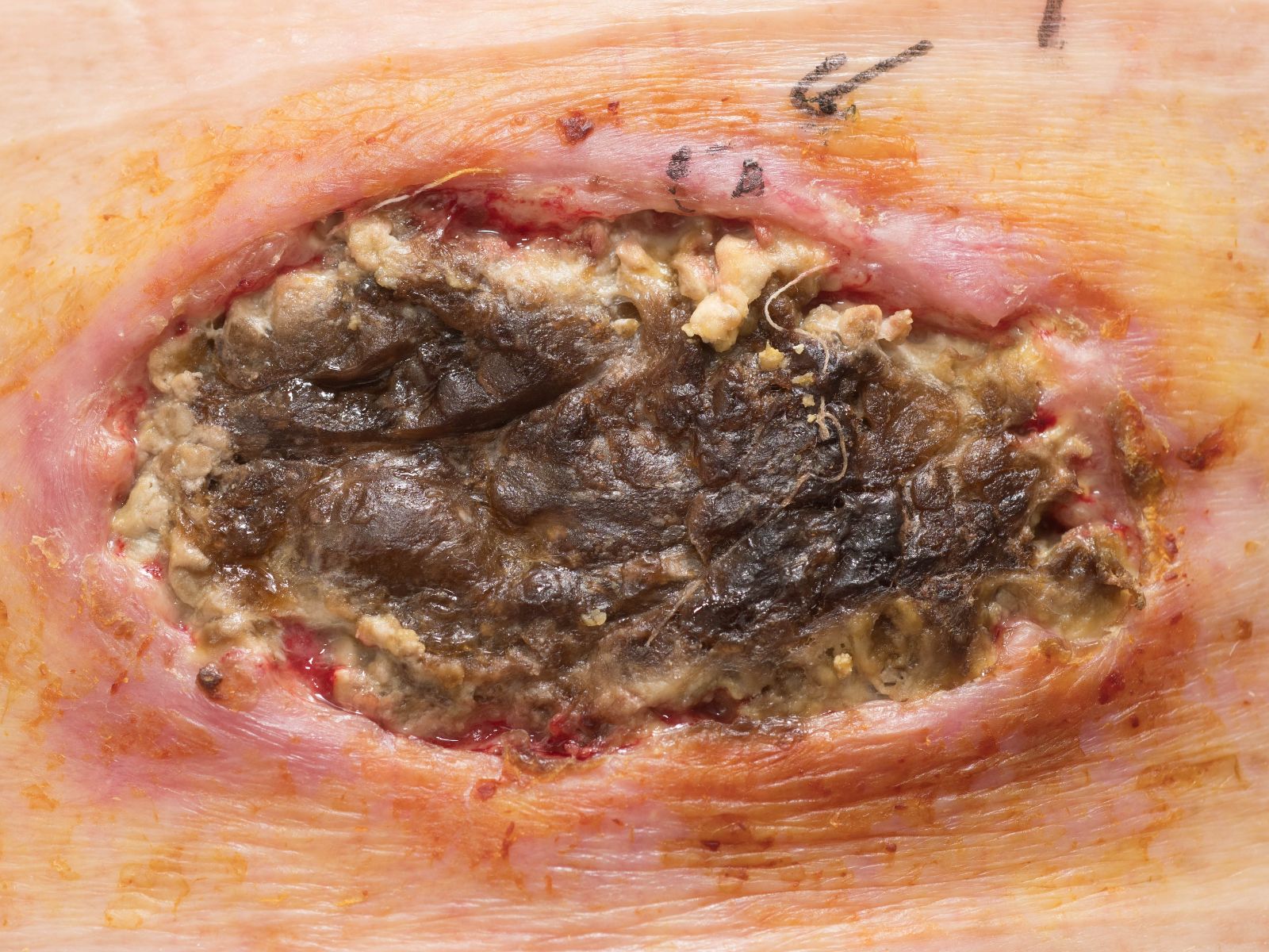 Therapie:Zo uitgebreid mogelijk chirurgisch debridement