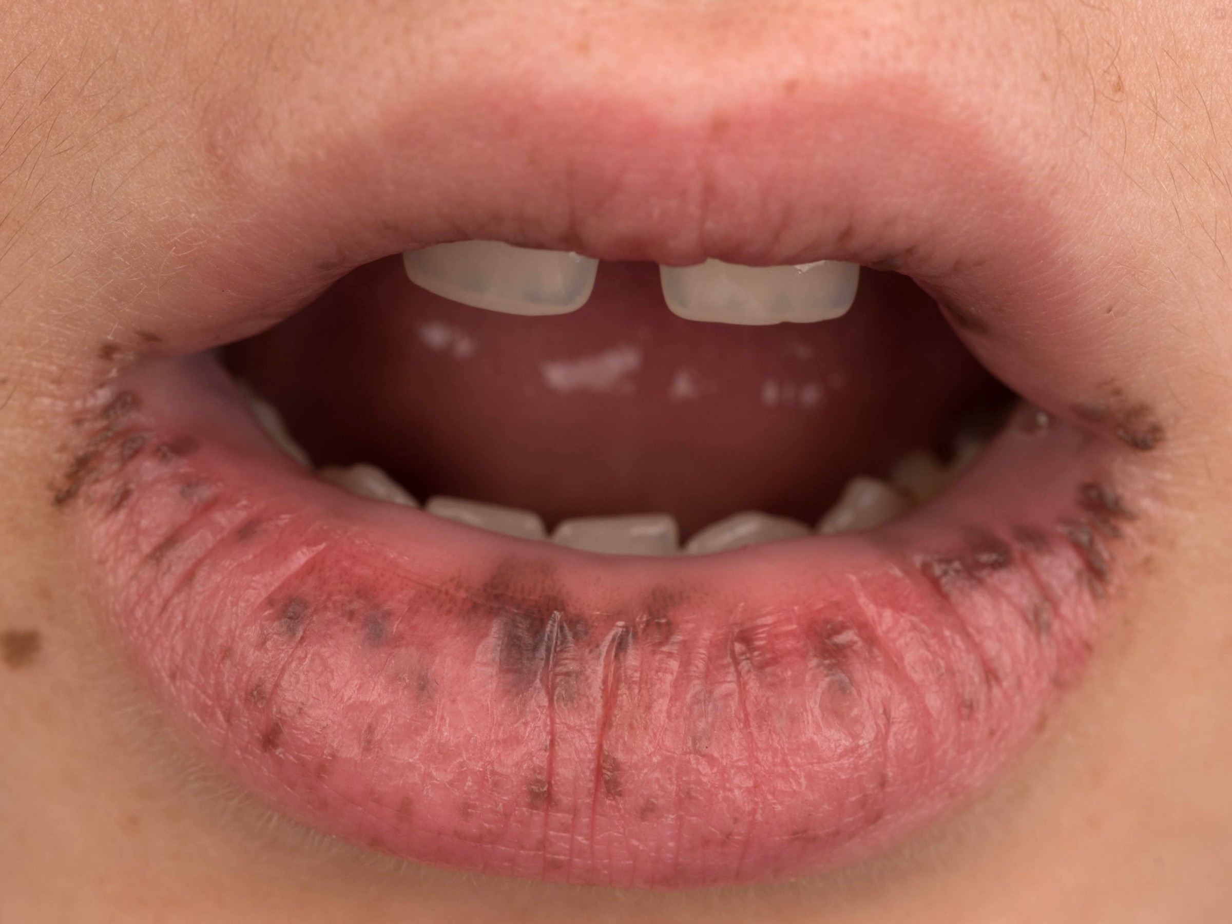 ![]() Lentigo simplex (lentigo juvenilis) Lentigines zijn scherp begrensde gehyperpigmenteerde macula van 3-15 mm, te beschouwen als epidermale melanocytaire naevi. De vlekjes ontstaan door toegenomen melanine depositie door een verhoogd aantal melanocyten per vierkante mm en hyperplasie van de melanocyten. Goedaardig, gaan nooit over in een melanoom. Bij de geboorte zijn er vaak al enkele aanwezig, het aantal kan later zonder relatie met zonlicht en zonder enige betekenis toenemen. Als het er zeer veel zijn spreekt men van lentiginosis, bij een plotselinge uitbarsting van lentiginosis eruptiva. Een lentiginosis kan onderdeel zijn van een syndroom, zoals het LEOPARD-syndroom. |
