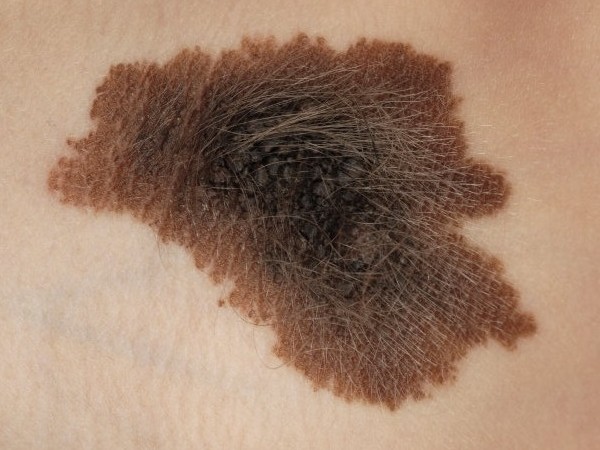![]() Naevus pigmentosus et pilosus (congenitale naevus) De naevus pigmentosus et pilosus is een gepigmenteerde en sterk behaarde naevus. De haren zijn dikker, donkerder of langer dan de normale haren in de omgeving. De naevus pigmentosus et pilosus is meestal vanaf de geboorte aanwezig en is dus ook een congenitale naevus. Een zeer uitgebreide variant van deze congenitale naevus heet de Tierfell naevus of giant hairy nevus. |