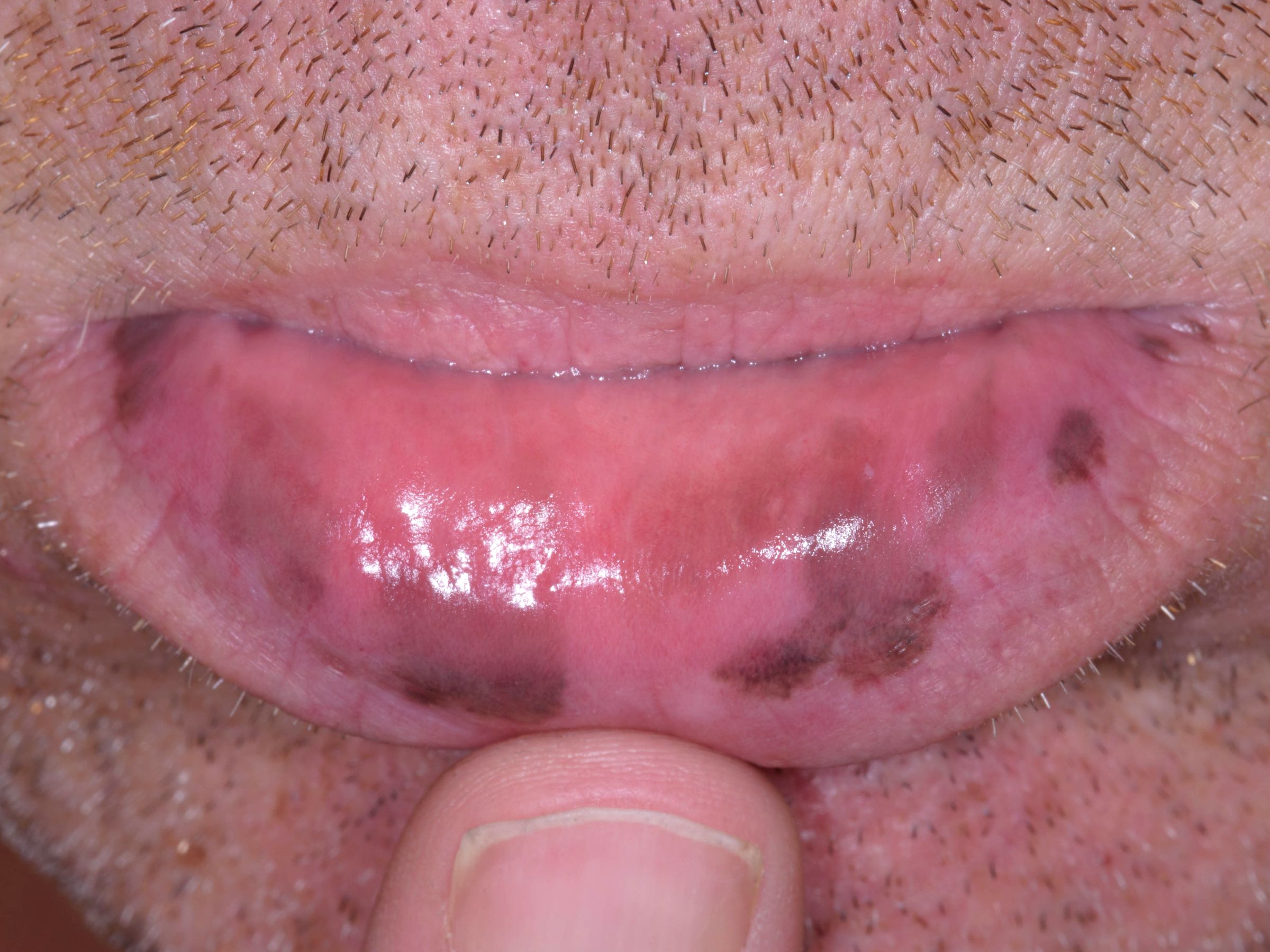![]() Laugier-Hunziker syndroom Het syndroom van Laugier-Hunziker een benigne aandoening van onbekende etiologie, waarbij melanocytaire pigmentaties van de lippen (met name de onderlip) en mondholte ontstaan. Deze presenteren zich als lenticulaire grijze, bruine of zwarte maculae. In ongeveer de helft van de gevallen komen er ook pigmentaties aan de nagels voor, vaak solitaire of multipele longitudinale bruine tot bruinzwarte banden in de nagel. De vingernagels zijn vaker aangedaan dan de teennagels. ZIe verder onder Laugier-Hunziker syndroom. |
