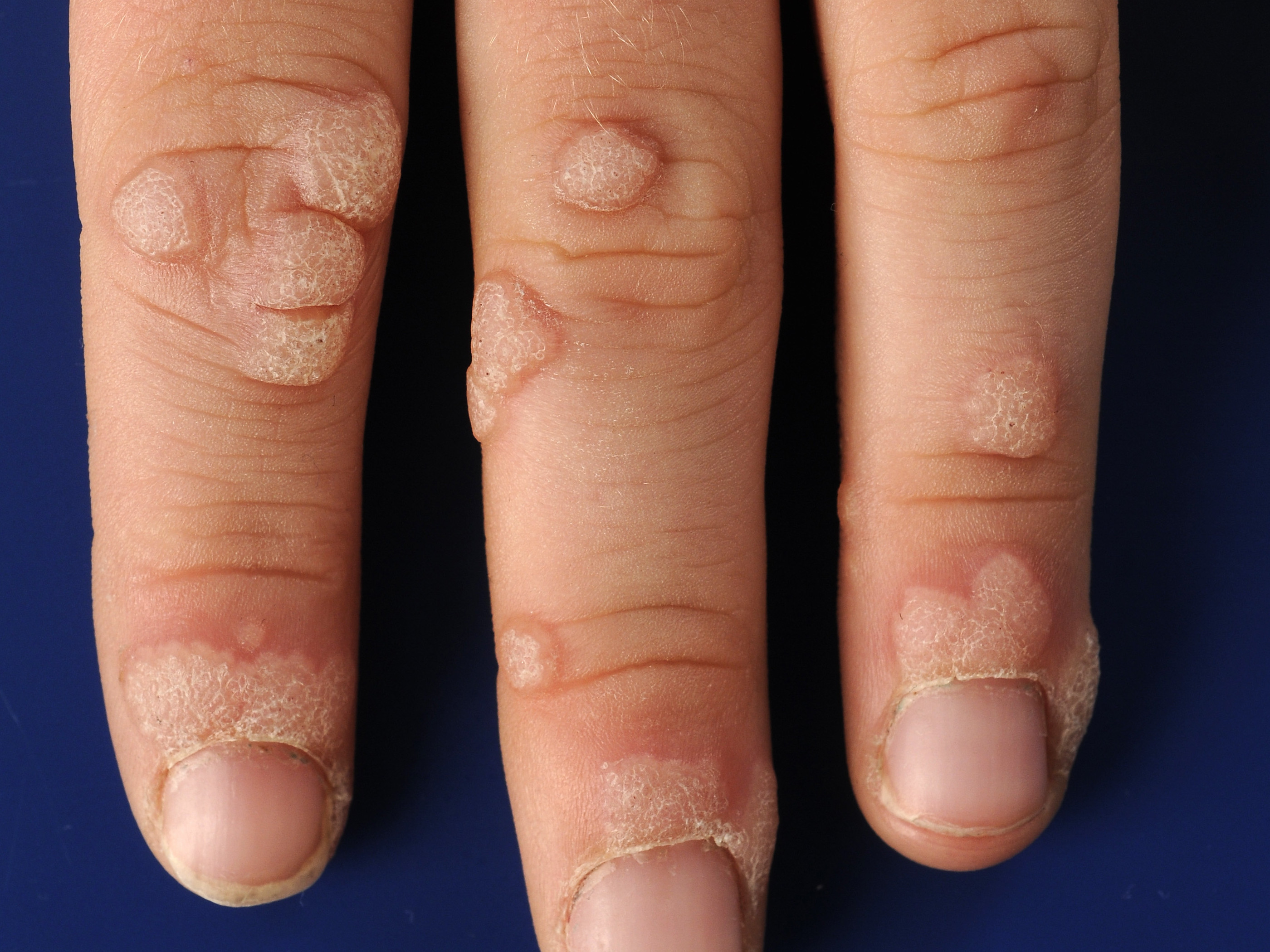 ![]() Verruca vulgaris Wratten zijn verruceuze, bloemkoolachtige tumoren, veroorzaakt door infectie met humaan papilloma virus (HPV). Wratten zijn besmettelijk. De gewone wrat (verruca vulgaris) zit meestal op de vingers of handen, of op de voetzool, en wordt vaak al op jonge leeftijd opgelopen. Zie verder onder verruca vulgaris. |