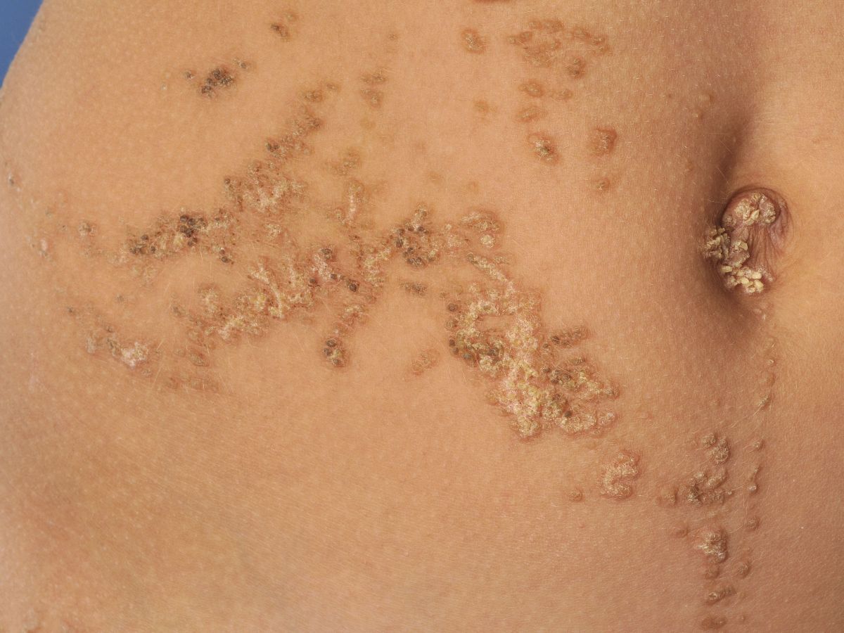 aanvoelende, soms lineaire hyperkeratotische laesies, klinisch lijkend op verrucae,