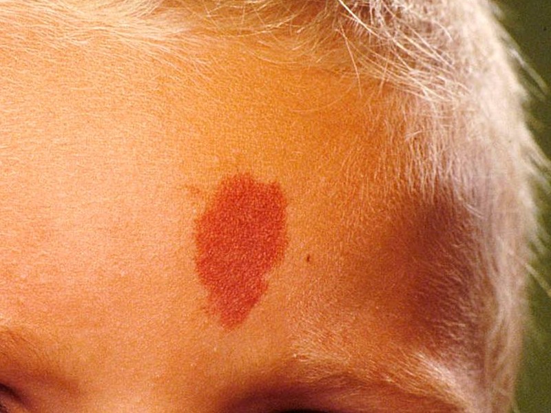 begin zijn het lichtrode teleangiëctatische macula, later wijnrood, rond de