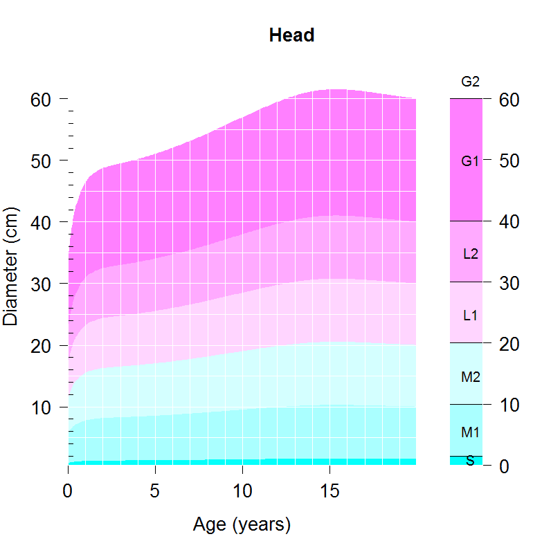 ze gaan worden: circa 1.7 x groter dan bij de geboorte voor lokalisatie op het hoofd, 2.8 x