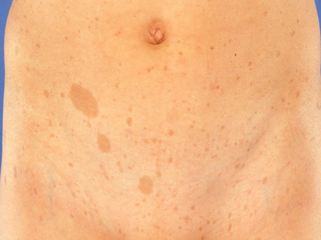 lichtbruin gepigmenteerde maculae (0.5-50 cm), niet exclusief voor NF indien