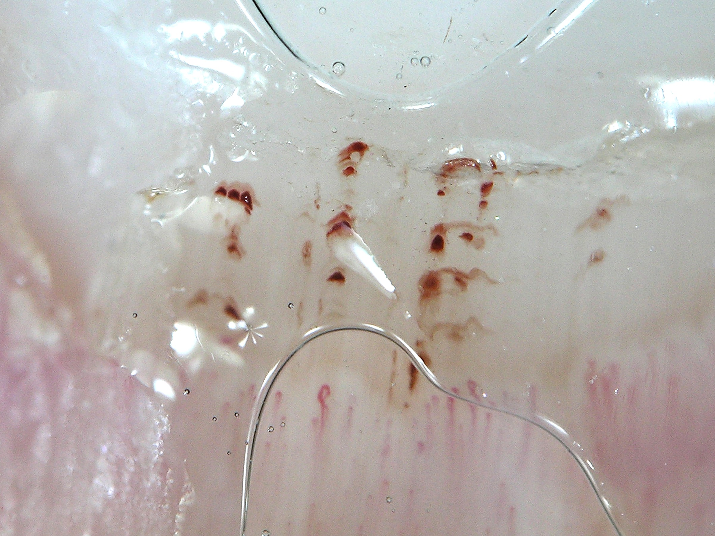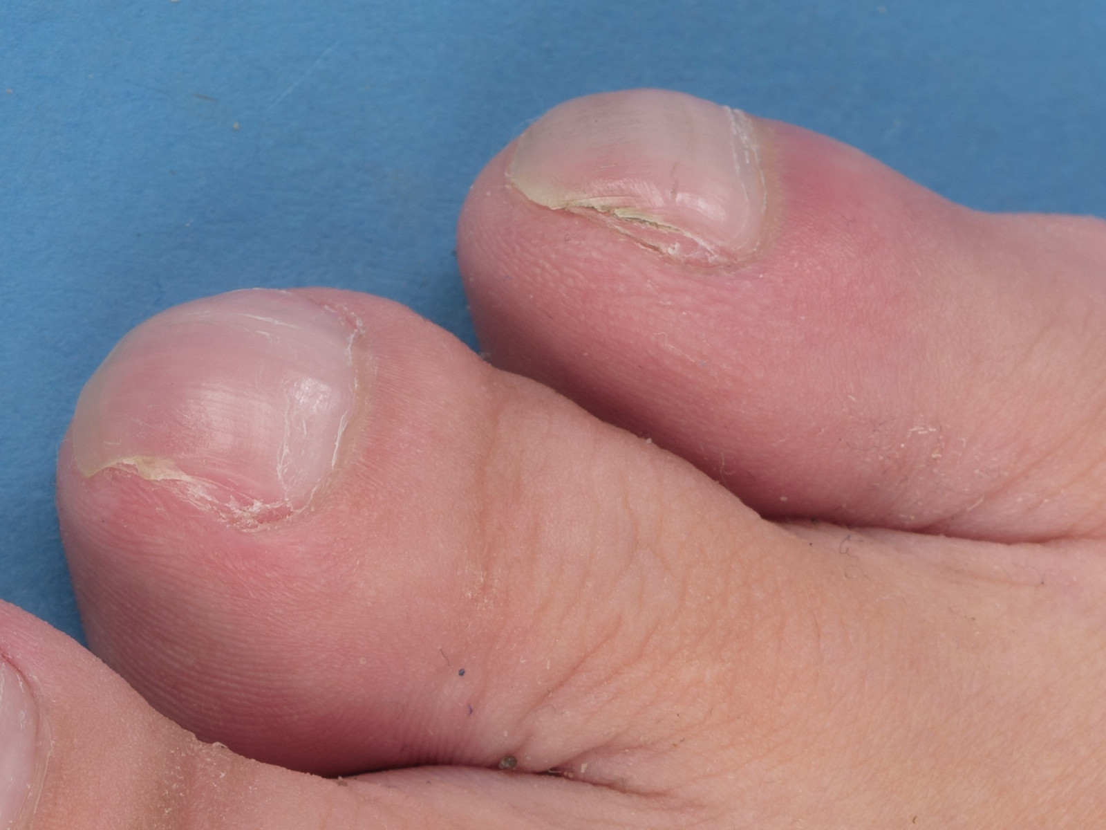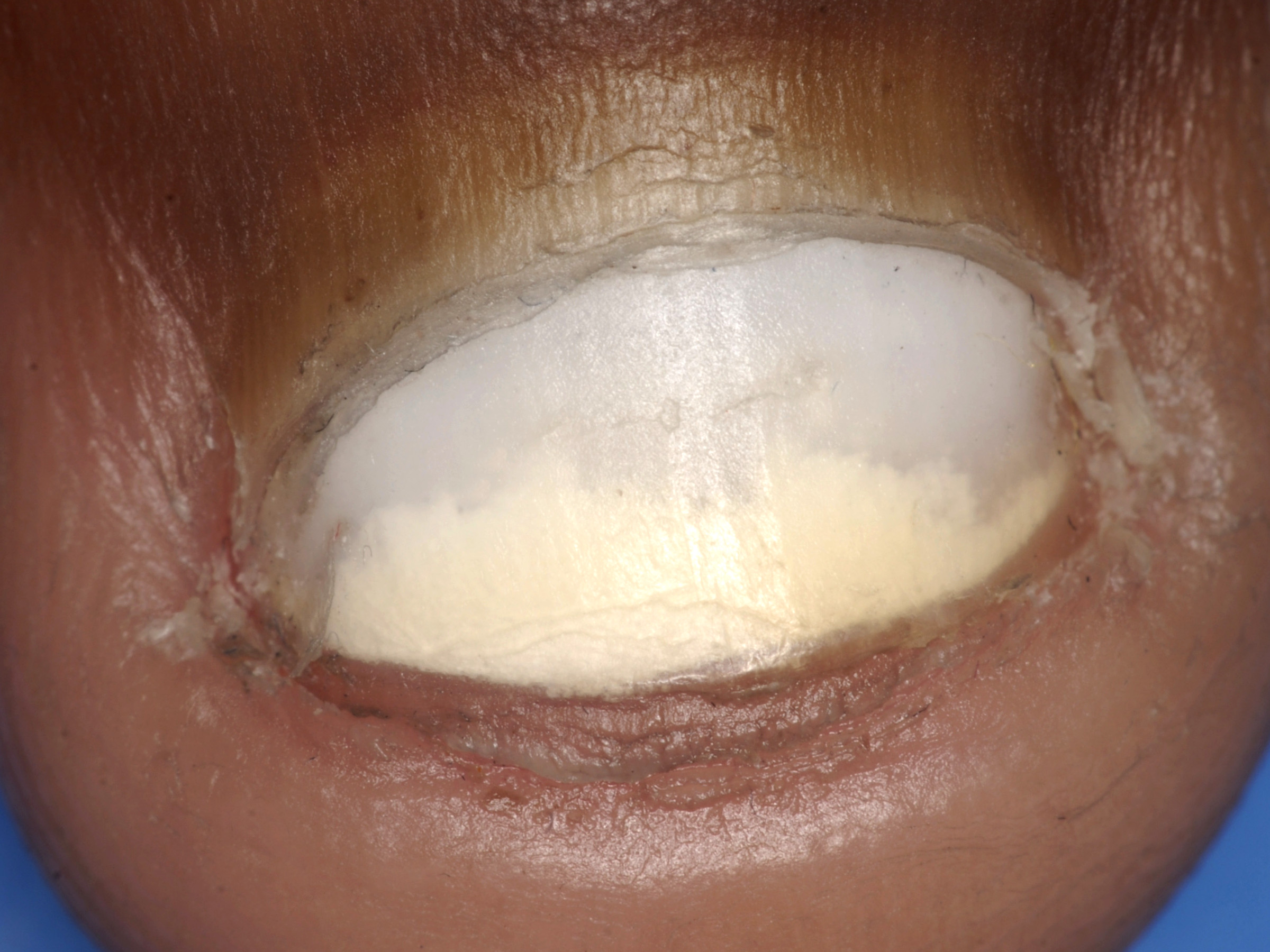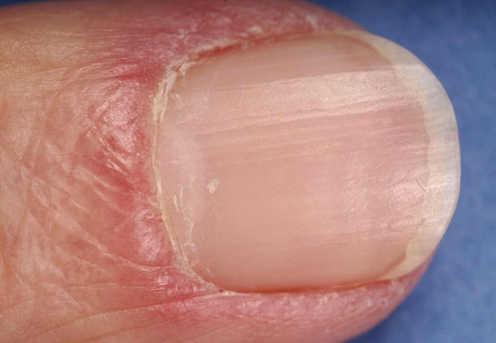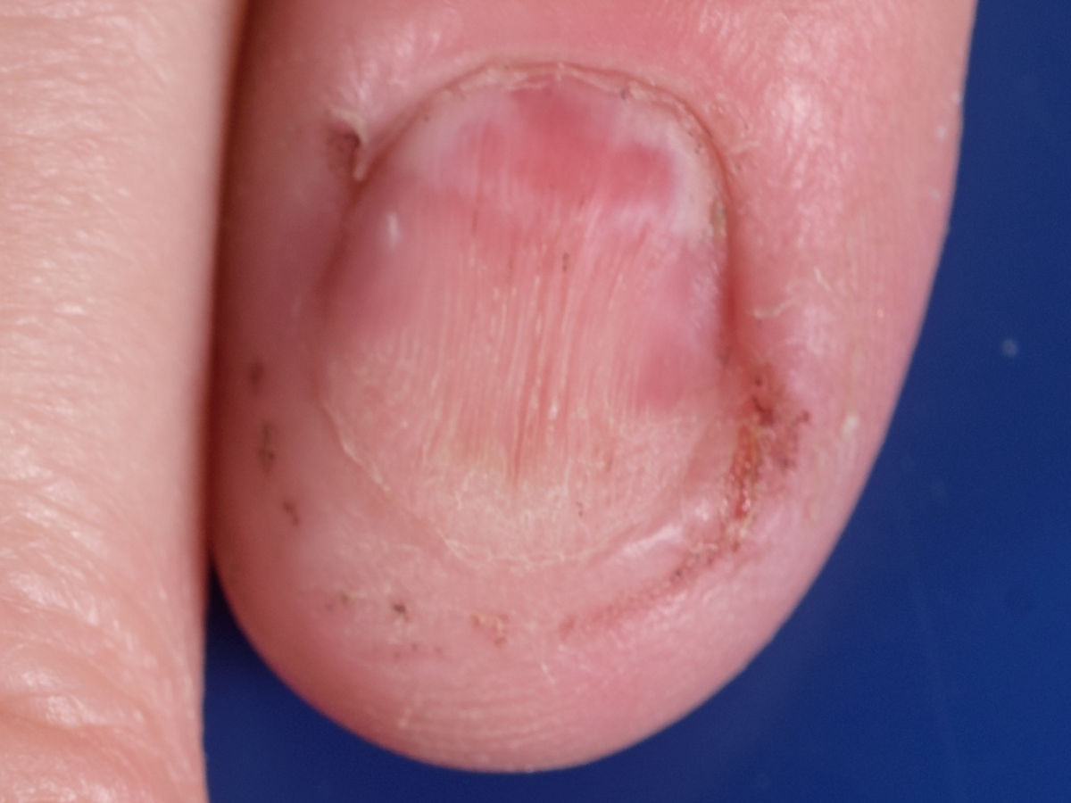 ![]() Beschadigde cuticula De cuticula is het dunne randje huid dat proximaal over de nagel heen groeit. Een intacte cuticula beschermd de nagelwal, sluit de ruimte tussen nagelplaat en eponychium af en voorkomt infecties (panaritium). Beschadigde cuticula komen voor t.g.v. pedicure behandelingen, pulken, langdurige blootstelling aan water, maar ook bij auto-immuunziekten zoals dermatomyositis. |