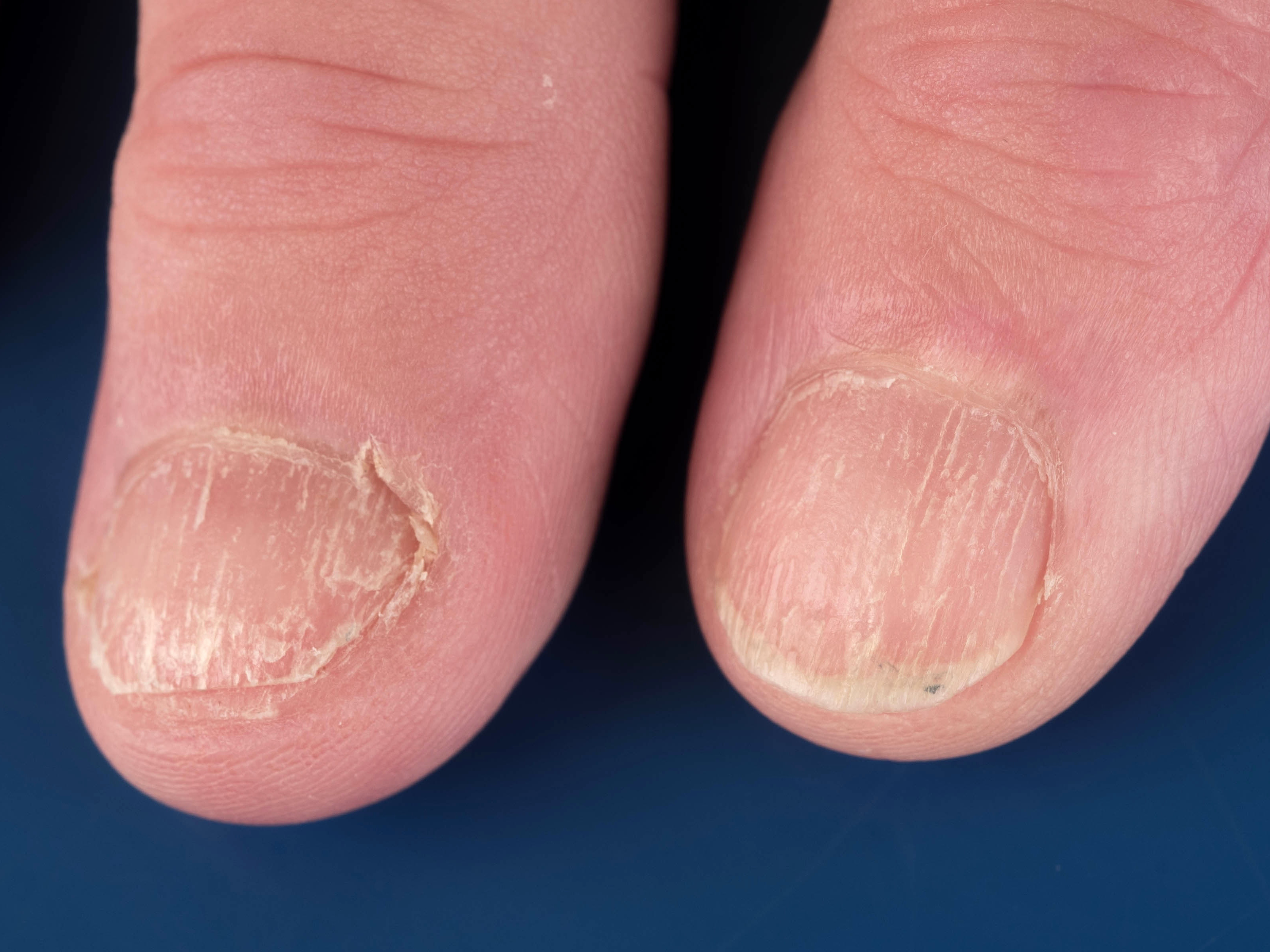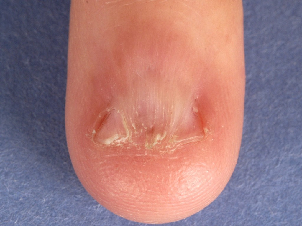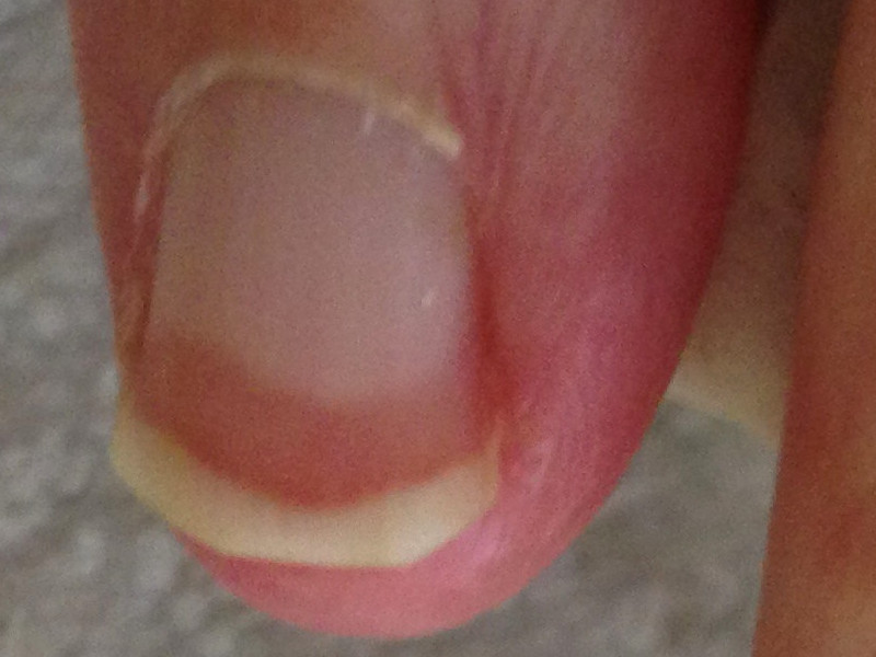 ![]() Dunne nagelplaat door trauma Continue blootstelling aan trauma (slijtage) is ook een mogelijke oorzaak van een dunne nagels |