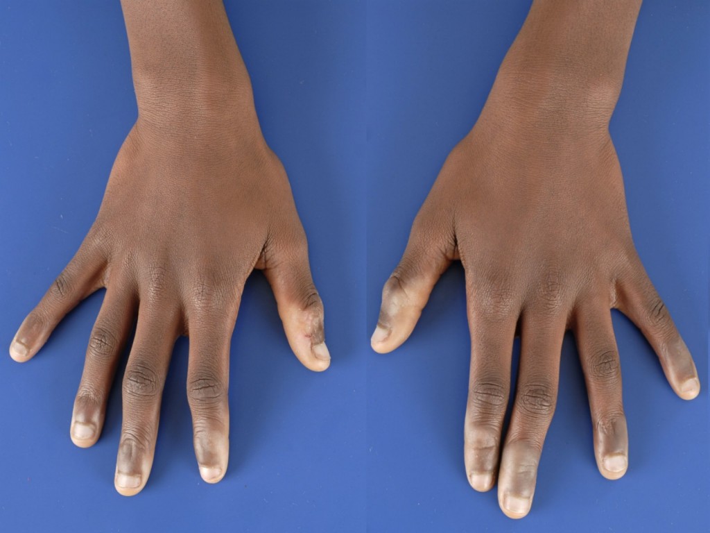 ![]() Trommelstokvingers (clubbed fingers), bolle nagels Bij trommelstokvingers zijn de nagels bolvormig, de hele eindkootjes zijn verdikt. Het is geassocieerd met een aantal interne aandoeningen, vooral hart en longafwijkingen die gepaard gaan met chronische ischemie. Het kan vanaf de geboorte aanwezig zijn of verworven. Het komt ook voor bij pachydermoperiostosis. Zie verder onder trommelstokvingers. Foto: IPFeditor - Wikimedia (Creative Commons License 3.0). |