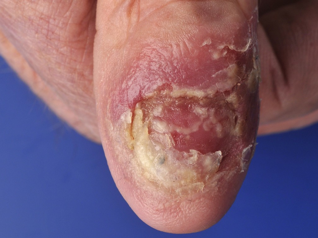 ![]() Panaritium door bacteriën Panaritium (fijt) is een diepe infectie van een vinger, meestal een uitbreiding van een paronychia (nagelriemontsteking, omloop) naar de diepte. De belangrijkste verwekker is S. aureus. De infectie kan overgrijpen op weke delen (diepe handflegmone), pezen, peesscheden (panaritium tendinosum), gewrichten, en botten (panaritium ossale), en zelfs tot verlies van een kootje leiden. Zie verder onder panaritium. Foto: Uwe Jendricke - Creative Commons License 1.0 - Public Domain Image). |