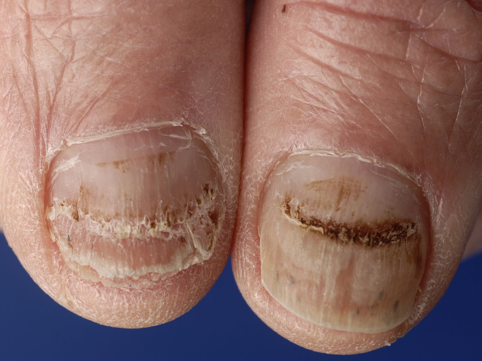 ![]() Bruine nagels Bruine nagels: bij donkere huid fysiologisch, indien bandvormig kan een subunguale naevus of een (acrolentigineus) melanoom of een hematoom aanwezig zijn (zie longitudinale melanonychia). Diffuse bruine verkleuring komt voor bij m. Addison en maligne melanoma, bij Wilson's disease (donkerbruin) en door exogene kleurstoffen (anthraline, kaliumpermanganaat, zilvernitraat, etc.). |