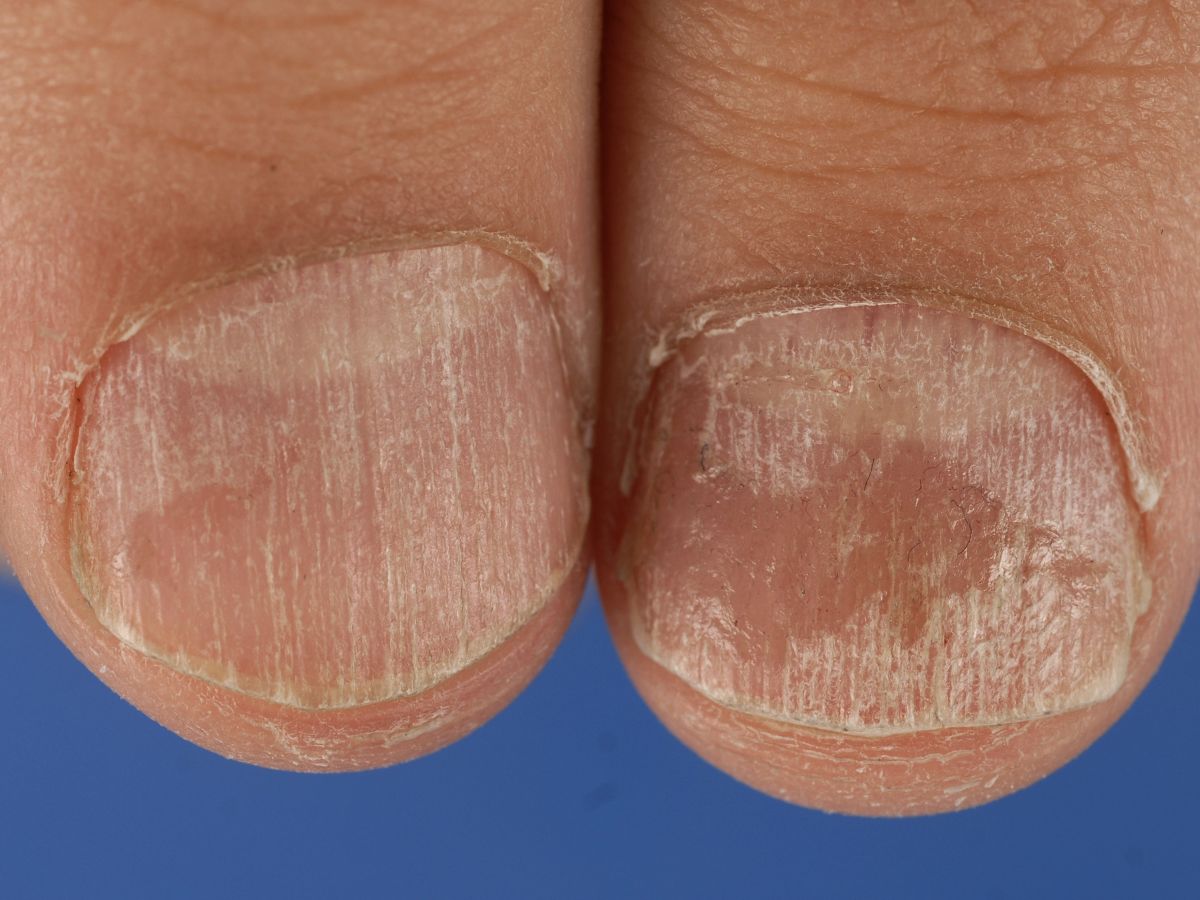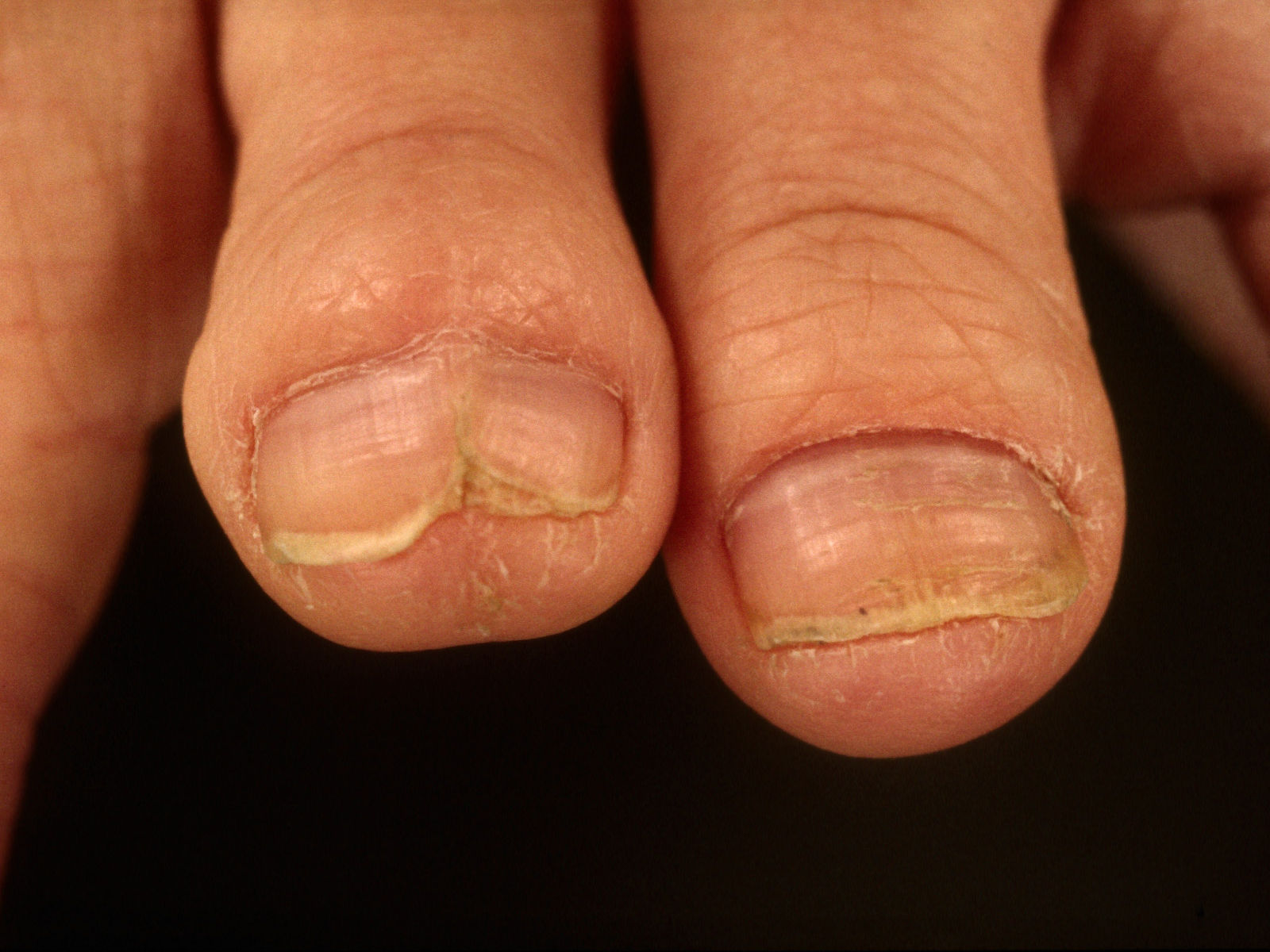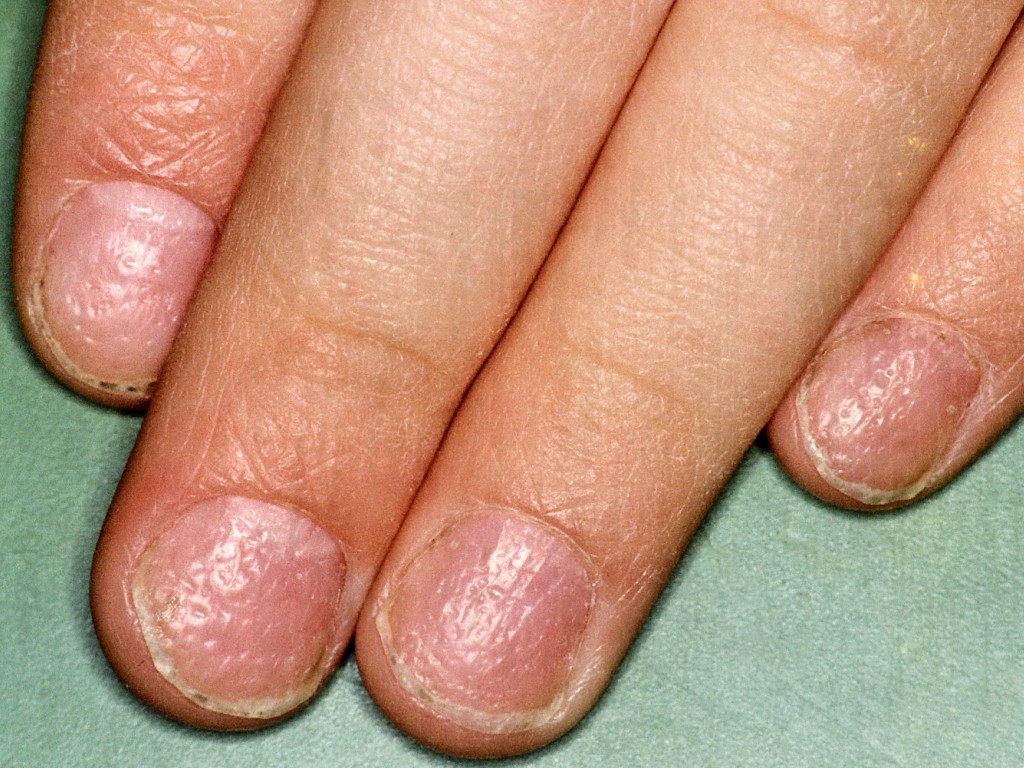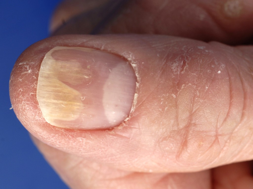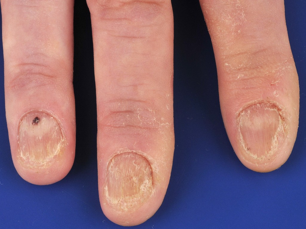 ![]() Distale onycholysis bij pityriasis rubra pilaris Nagelafwijkingen bij pityriasis rubra pilaris kunnen zijn verdikking van de nagel (subunguale hyperkeratose), distale loslating (distale onycholyse), en bruine verkleuring (olievlekfenomeen). Dezelfde verschijnselen kunnen ook worden gezien bij psoriasis unguium. Zie verder onder pityriasis rubra pilaris. |