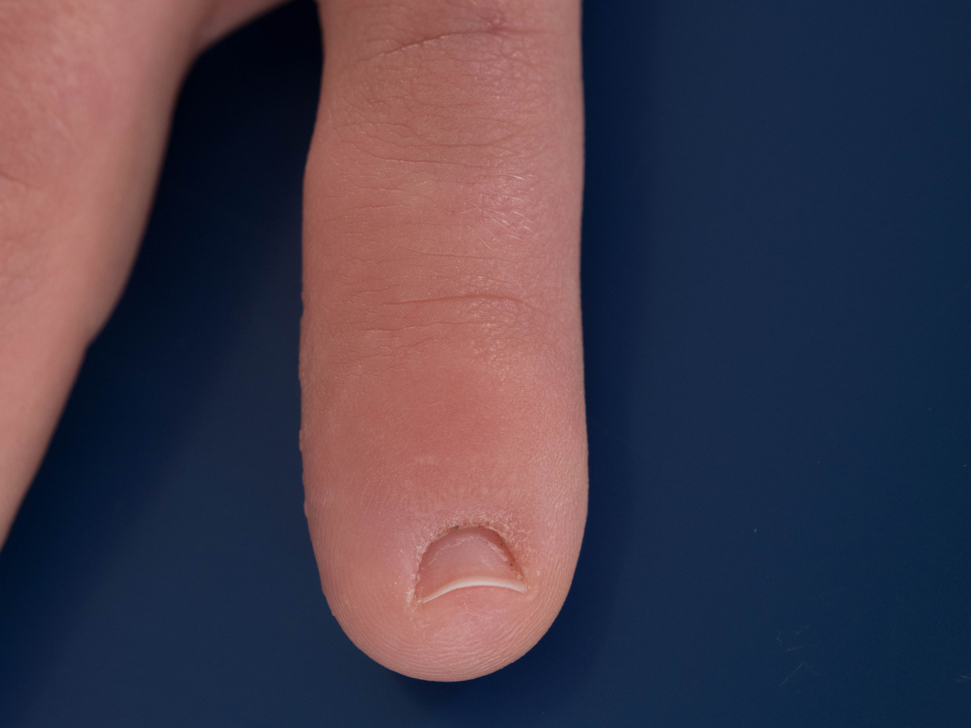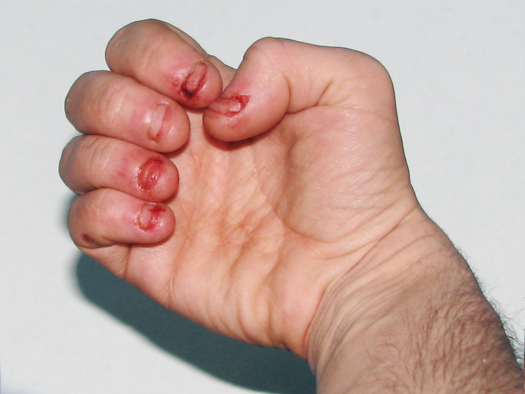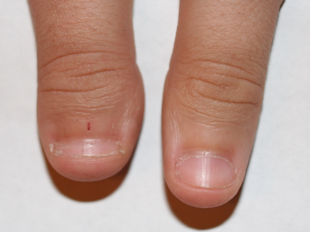 ![]() Onychophagie (nagelbijten) Bij nagelbijten zijn de nagels kort (brachyonychia) en beschadigd. Foto: 6th Happiness - Wikimedia (Creative Commons License 3.0). |