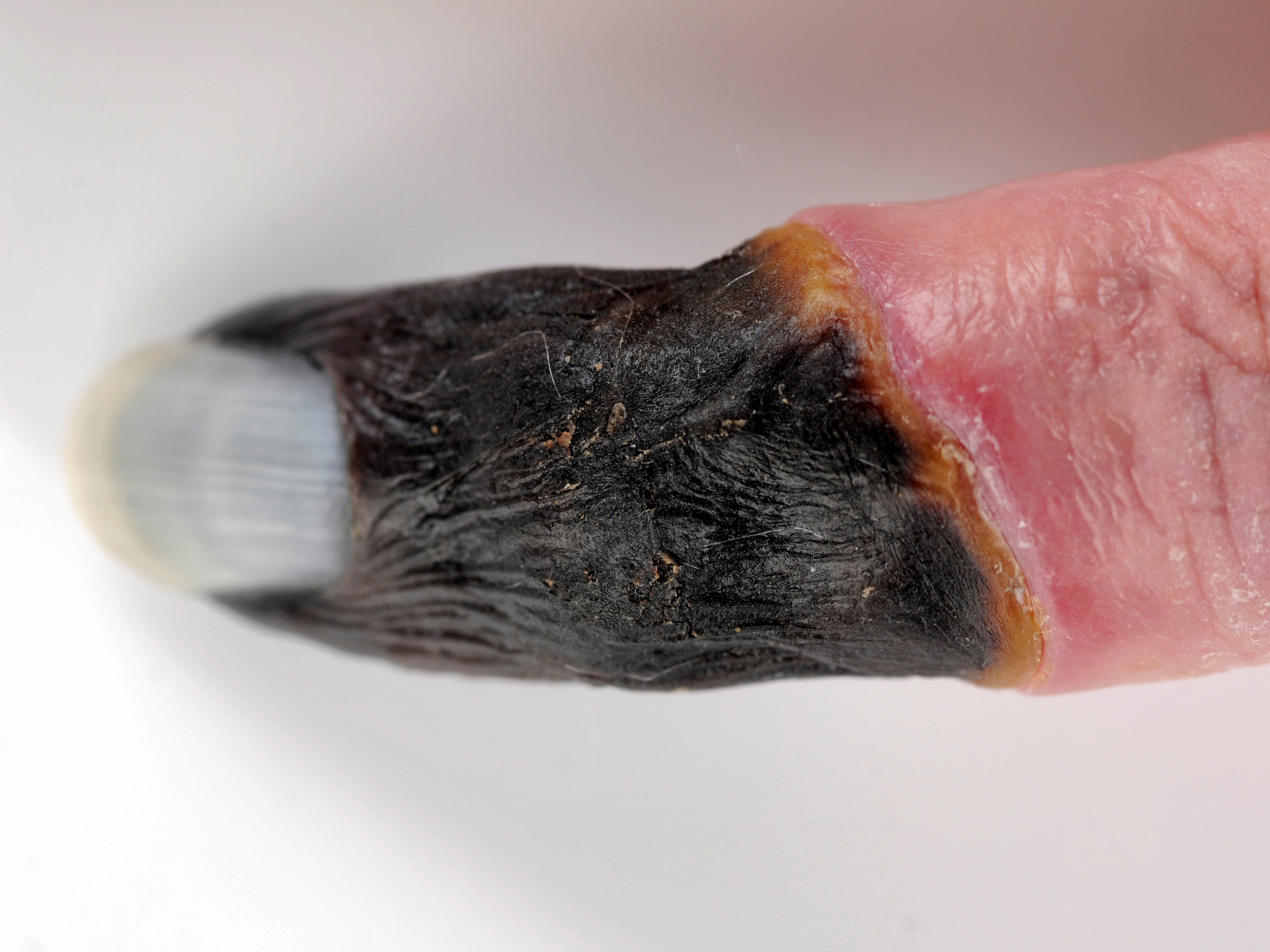 ![]() Polydactylie Polydactylie kan partieel zijn, alleen het distale kootje kan geheel of gedeeltelijk gespleten zijn, in dat geval is er een dubbele nagel of een brede nagel. Foto: FBenjr123 - Wikimedia (Creative Commons License 4.0). |