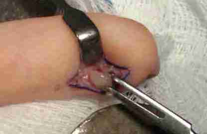 ![]() Mucoid cyste / digital mucous cyst Een mucoid cyste (digital mucous cyst) is een huidkleurig of glanzend doorschemerend solitair tumortje op het dorsale gedeelte van het distale kootje van de vinger (en soms de teen). Het komt vooral bij ouderen voor (> 40 jaar), iets vaker bij vrouwen. Het tumortje kan enkele millimeters tot een centimeter groot zijn en bevindt zich tussen het distale interphalangeale gewricht en de nagel. Het is gevuld met een helder, slijmerig, visceus vocht. Als de cyste in de buurt van de nagel zit, kan er door druk op de nagelmatrix een groef of deuk in de nagel ontstaan, in het verlengde van de cyste. Het veroorzaakt meestal geen klachten. Zie verder onder mucoid cyste. |