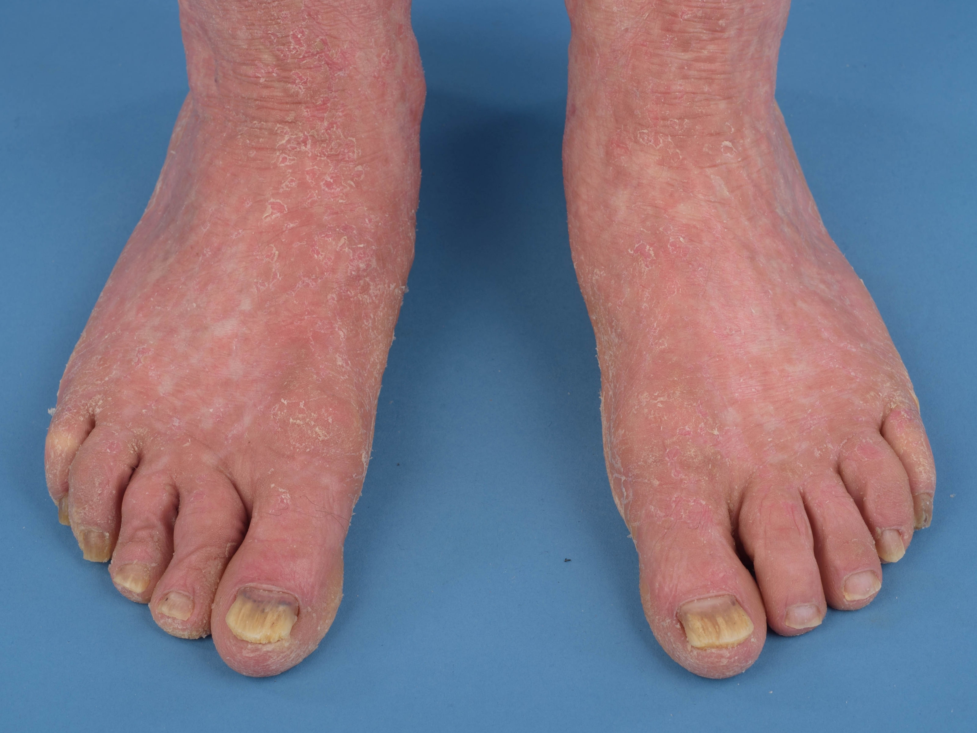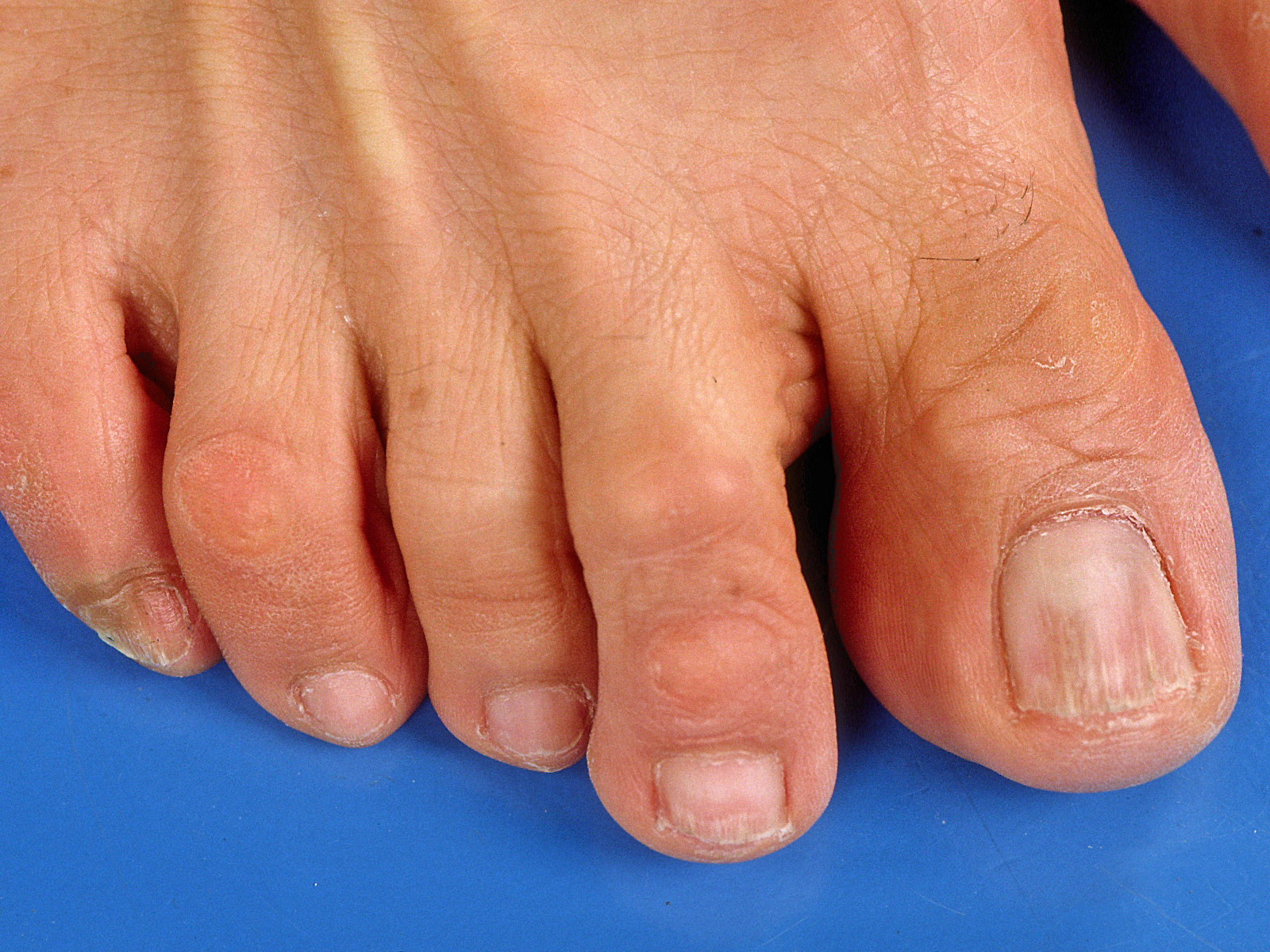 ![]() Hyperkeratose bij pityriasis rubra pilaris Nagel afwijkingen bij pityriasis rubra pilaris kunnen zijn verdikking van de nagel (subunguale hyperkeratose) en distale loslating (distale onycholyse). Dezelfde verschijnselen kunnen ook worden gezien bij psoriasis unguium. |